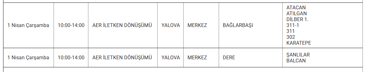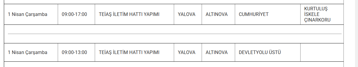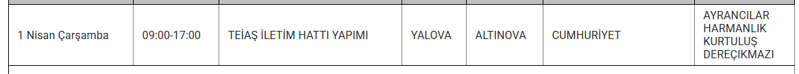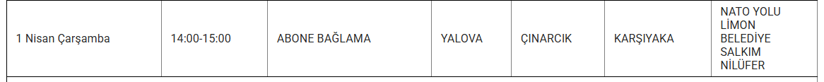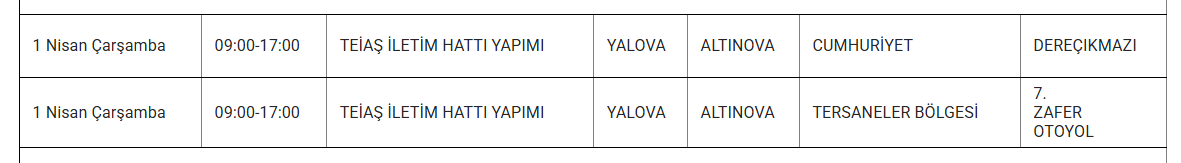 UEDAŞ, Yalova'da 1 Nisan Çarşamba günü bazı mahallelerde programlı bakım ve onarım faaliyetleri sebebiyle elektrik kesintisi olacağını ifade etti. Kesintiden etkilenecek ilçeler ve zaman dilimleri duyuruldu.