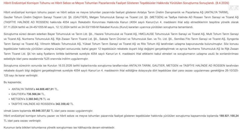 Böylece hibrit endüstriyel kornişon tohumu pazarı ile hibrit sebze ve meyve tohumları pazarında faaliyet gösteren teşebbüsler hakkında Kasım 2024’ten itibaren yürütülen soruşturma kapsamında toplamda yaklaşık 189 milyon lira idari para cezası tesis edildi.