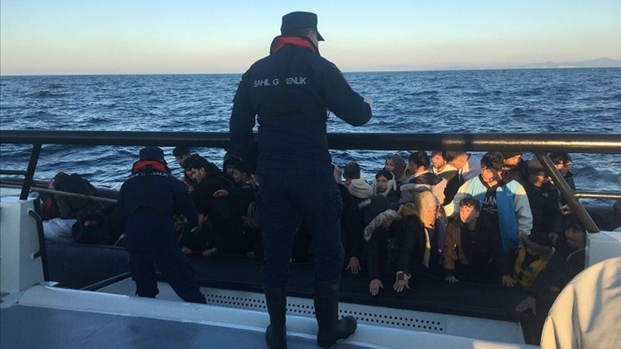 Bölgeye yönlendirilen ekipler, hareketli lastik bottaki 59 düzensiz göçmeni yakaladı.