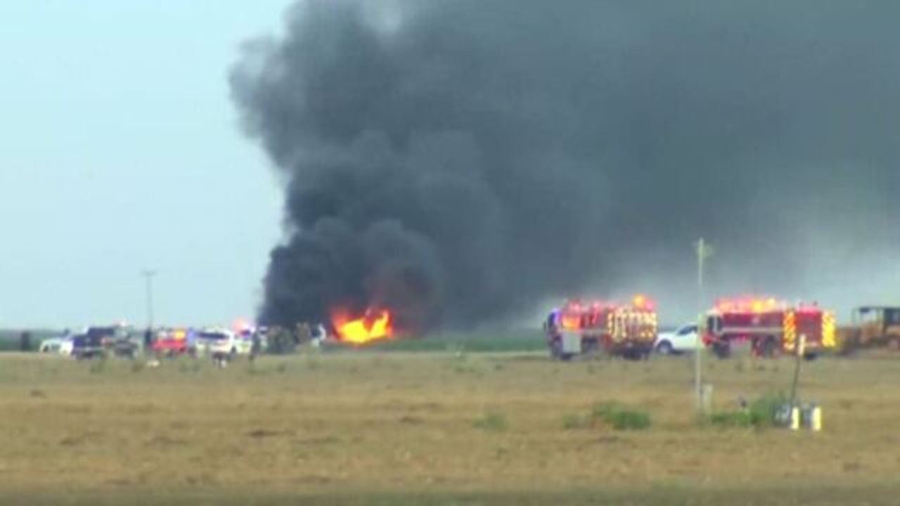 Olay yeri görüntülerinde, uçağın düştüğü açık alanda alev ve yoğun dumanın yayıldığı görüldü.