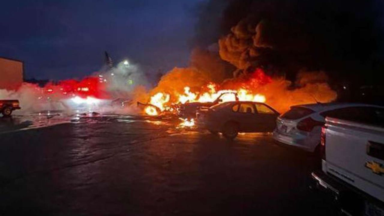 Kazada, 2 kişi hayatını kaybederken, araç galerisinin otoparkına düşen uçak nedeniyle çıkan yangında 8 araç alev aldı.