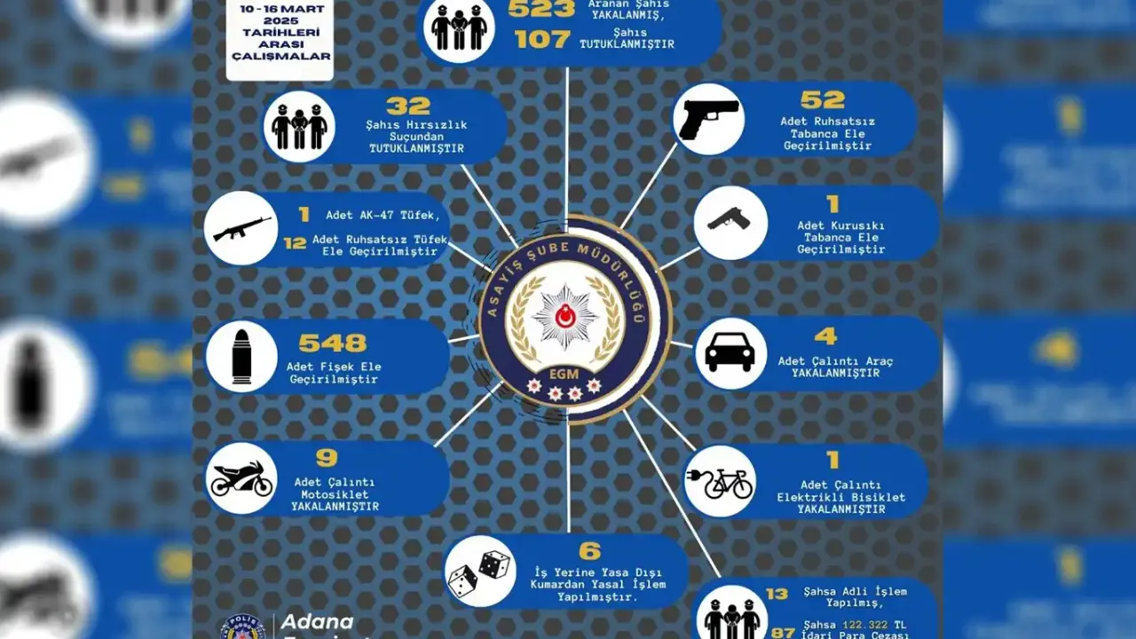 Adana İl Emniyet Müdürlüğü ekipleri, 10-16 Mart 2025 tarihleri arasında asayiş uygulamaları gerçekleştirdi. Denetimlerde çeşitli suçlardan aranan 523 kişi yakalanırken, 107 kişi tutuklandı.