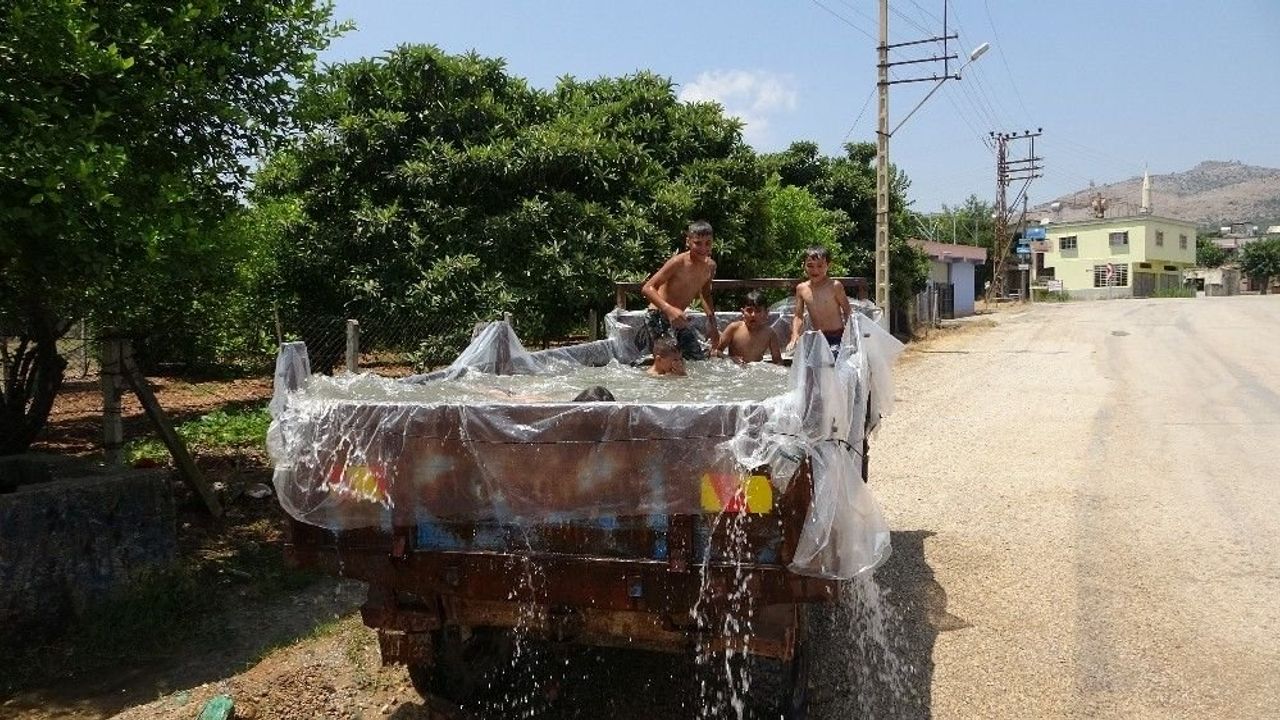 Adana"nın Kozan ilçesinde bir çiftçi, traktörün römorkunu havuza çevirdi.