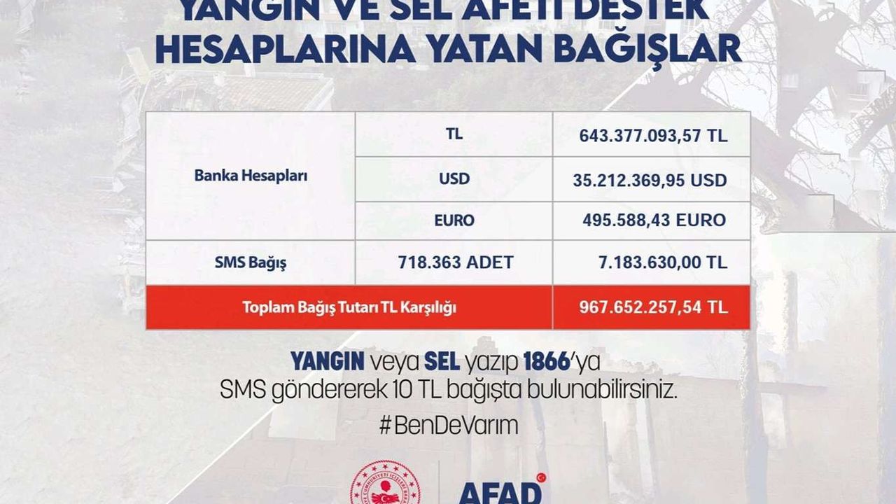İçişleri Bakanlığı Afet ve Acil Durum Yönetimi Başkanlığı (AFAD), yangın ve sel afeti destek hesaplarına yatan bağışların güncel durumu kamuoyu ile paylaştı.