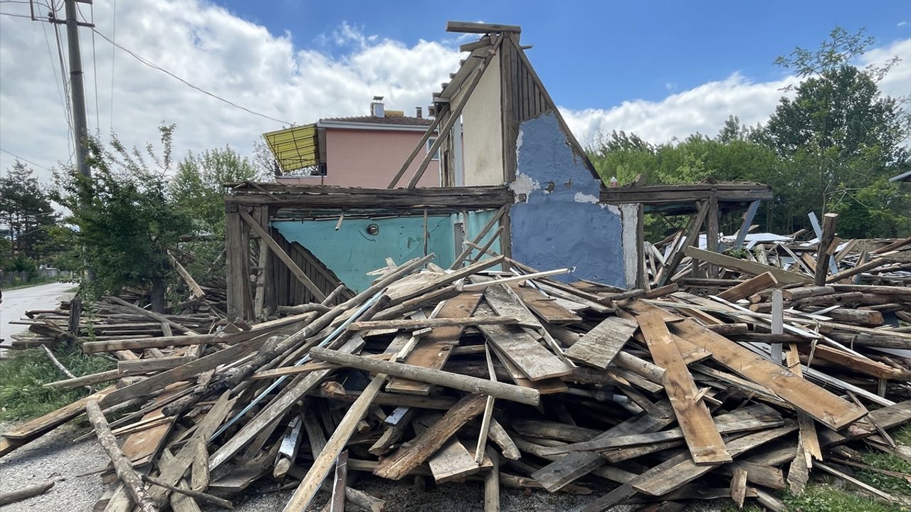 Karacaağaç Mahallesi Hacılar Sokak'ta yıkımı yapılan ahşap evin baca kısmı çöktü.