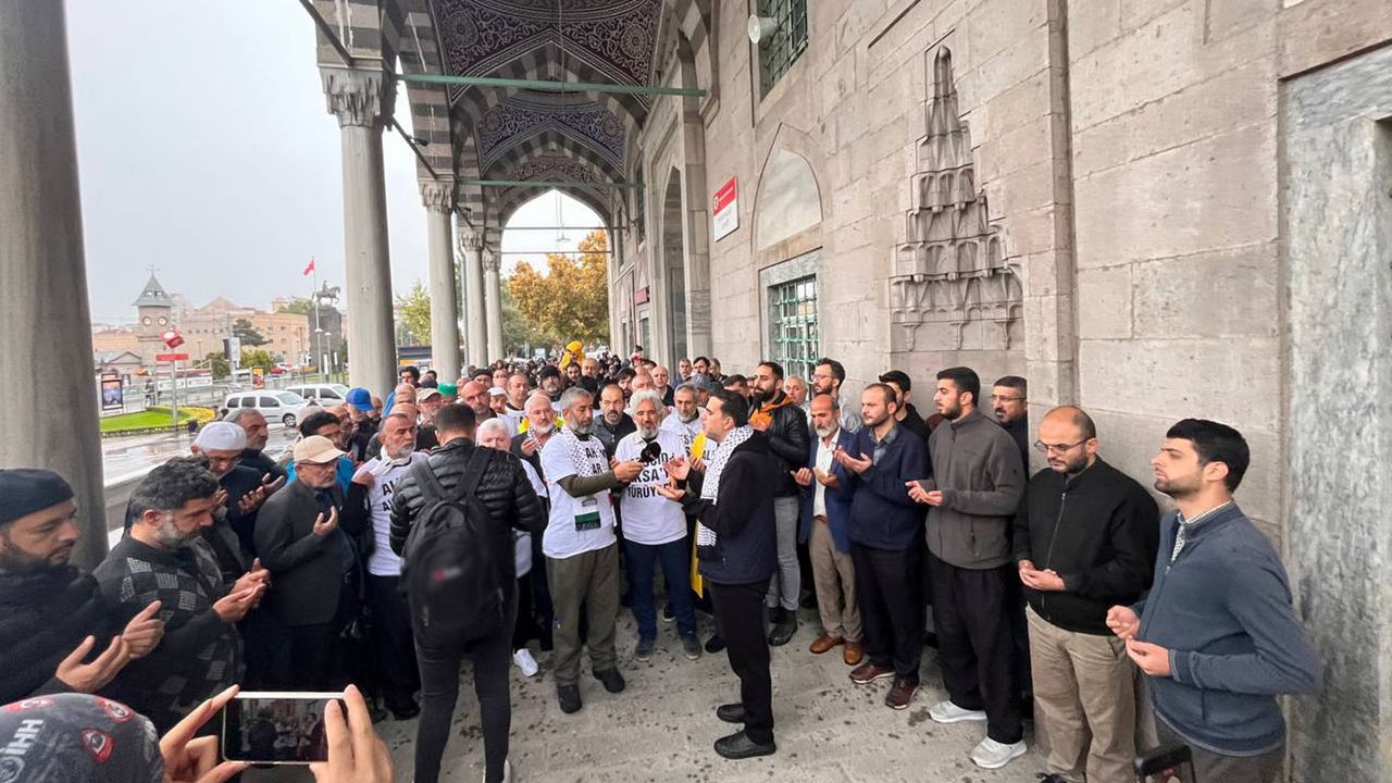 Burada platform adına bir konuşma ve dua yapan Sadi Özmen, bir avuç Müslümanın bugün burada terör şebekesinin zulümlerine dur demek ve Filistinli kardeşlerinin yanlarında olduklarını gösterme adına toplandıklarını ve yola çıkacaklarını söyledi.