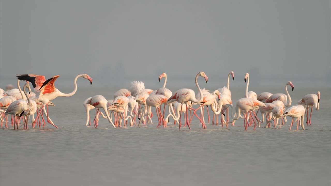 Bölgede konaklayan flamingolar, lagüne renk kattı.