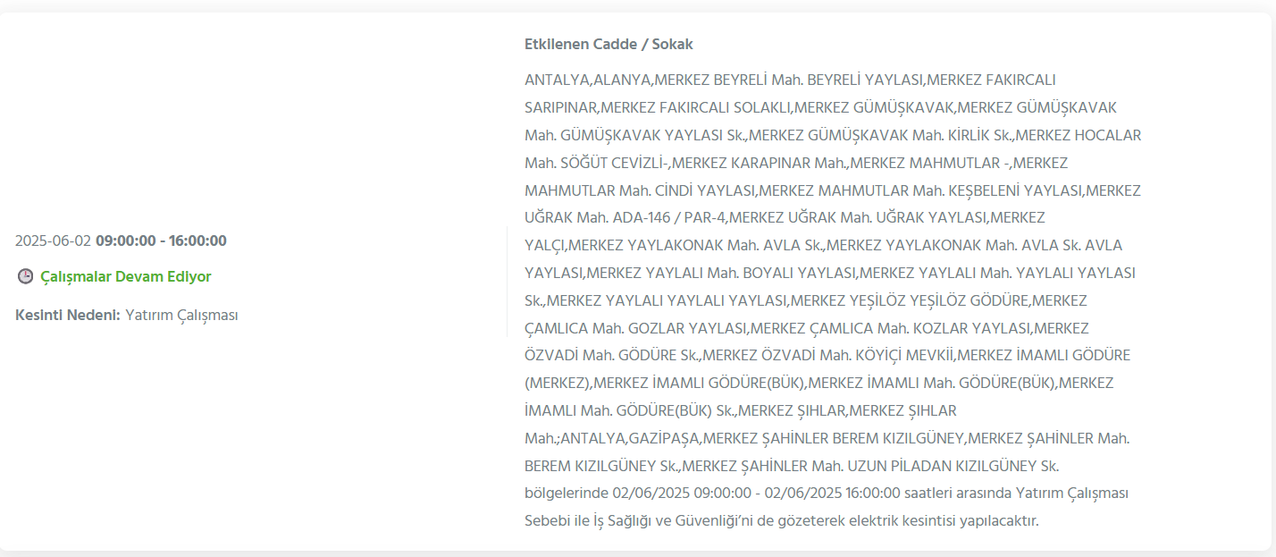 ALANYA YARIN 2 HAZİRAN ELEKTRİK KESİNTİSİ YAŞANACAK İLÇE VE MAHALLELER