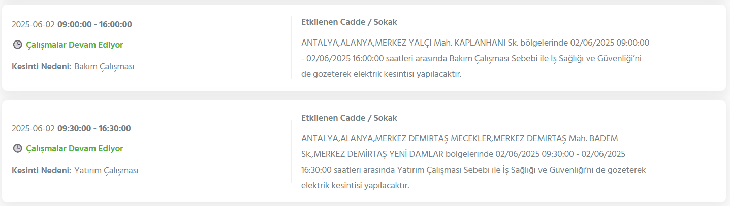 Bu kesintiler, AKDENİZ Elektrik Dağıtım A.Ş. (AKDENİZEDAŞ) tarafından planlanan bakım ve onarım çalışmaları kapsamında gerçekleştiriliyor. İlerleyen günlerin planlı kesintiler hakkında bilgi almak için AKDENİZ Elektrik Kesintisi Sorgulama sayfasını ziyaret edebilirsiniz.