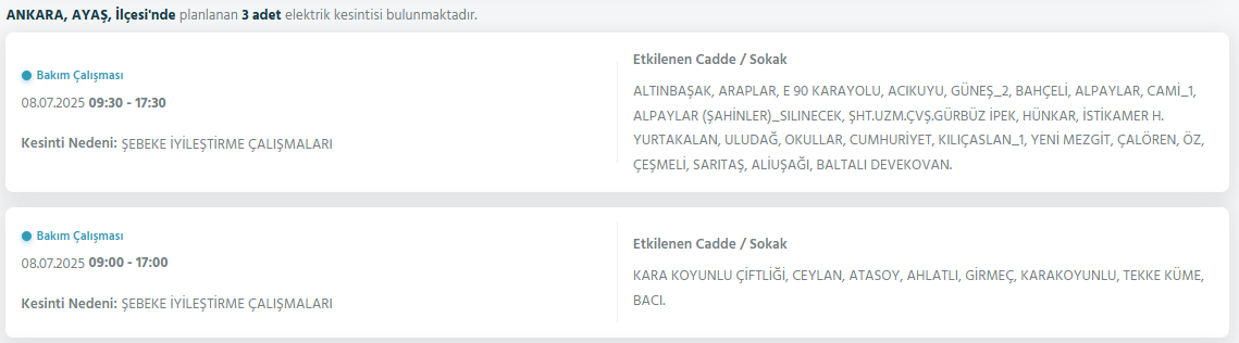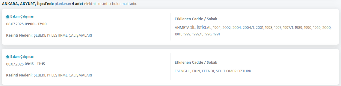 Başkent Ankara’da yaşayan vatandaşlar bugün birçok bölgede elektrik kesintisiyle karşılaştı. Akyurt, Çankaya, Etimesgut ve Gölbaşı ilçelerinde farklı mahalle ve sokaklarda şebeke arızaları ve planlı bakım çalışmaları nedeniyle enerji verilemiyor.