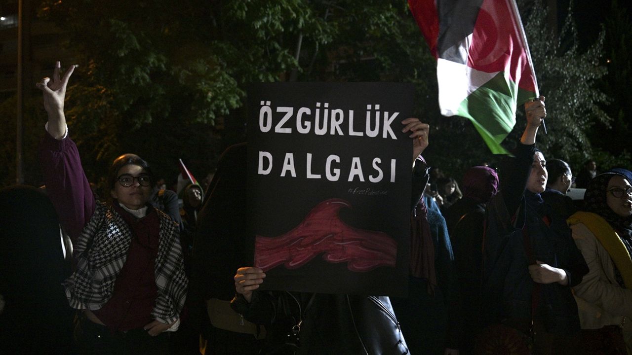 Ankara Filistin Dayanışma Platformu (ANFİDAP) tarafından yapılan çağrı üzerine üyeler ve vatandaşlar, ABD'nin Ankara Büyükelçiliği önünde toplandı.