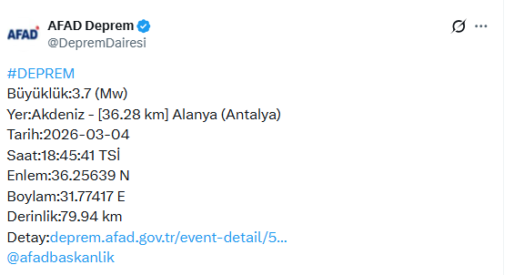 Afet ve Acil Durum Yönetimi Başkanlığı (AFAD) Antalya'nın Alanya ilçesi açıklarında saat 18.45'te 3.7 büyüklüğünde deprem meydana geldiğini duyurdu.