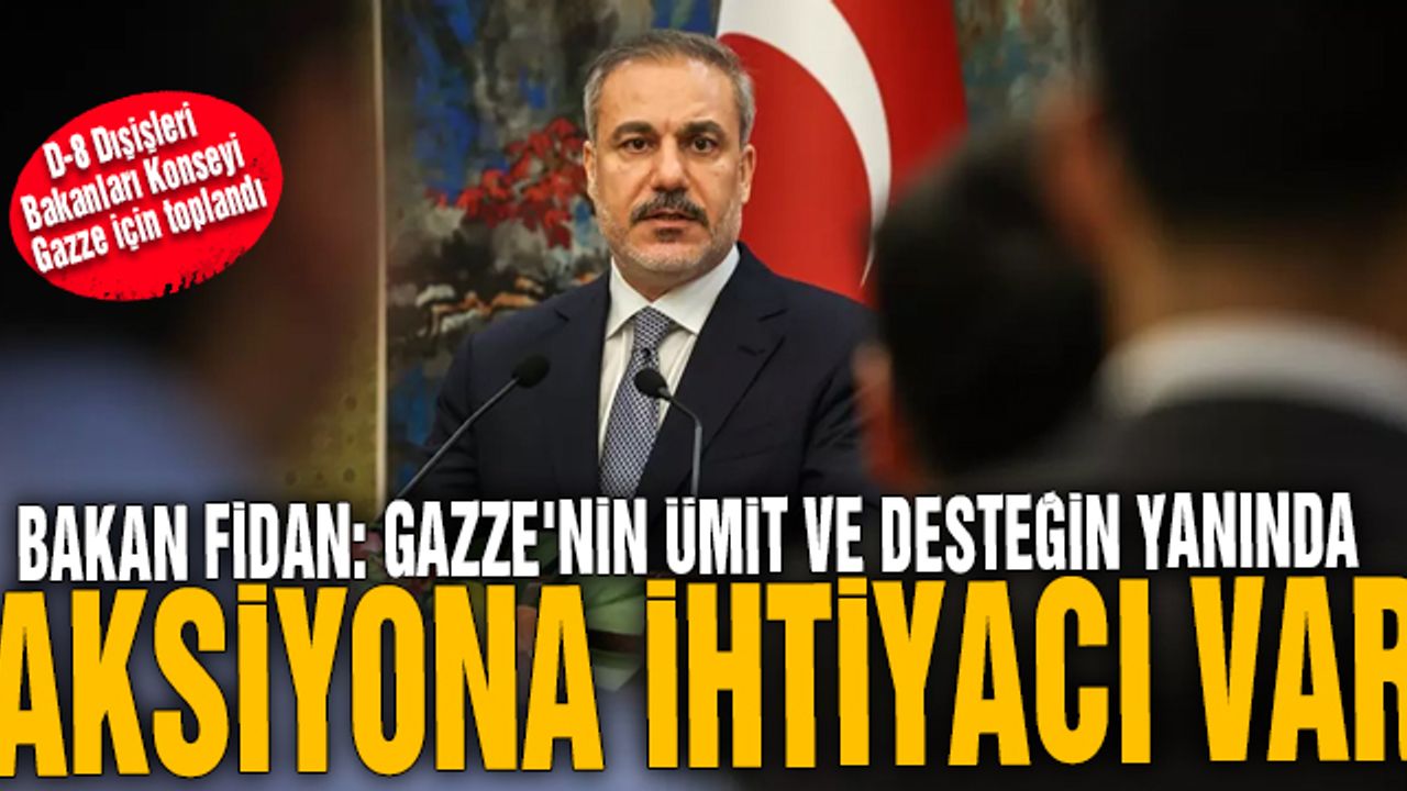Bakan Fidan, buradaki konuşmasında "Bugün D-8 ülkeleri Bangladeş, Mısır, Endonezya, İran, Malezya, Nijerya, Pakistan ve Türkiye olarak İstanbul'dan Filistin'e desteğimizi en güçlü şekilde duyuruyoruz. Dünya birçok farklı engelle ve belirsizlikle mücadele ederken bu ilkeler giderek daha önem kazanıyor. Bu olağanüstü bakanlar konseyi toplantısı Filistin için daha fazla destek seferberliği ve dayanışmayı gösterme amaçlı bir araya geldi. Gazze'nin ümide ve desteğe ihtiyacı var fakat bütün bunlardan öte aksiyona ihtiyacı var. Bu savaş İsrail-Filistin savaşı değil küresel demokrasiye bir meydan okuma. Uluslararası sistem iki yüzlülük ve bazı ülkelerin körlüğü nedeniyle aslında çöküşe geçti. Gözlerimizin önünde gerçekleşen son 8 aydır Gazze'deki gelişmeler aslında normları ve değerlerin erozyonunu gösteriyor. israil kıyımının devam etmesi toplumsal gerilimi ve halkların öfkesini tetikliyor. Uluslararası sistem bir çözüm getiremediği sürece aslında İslam dünyası olarak bu probleme sahip çıkmak ve kalıcı bir çözümün liderliğini yapmak bize düşüyor." dedi.