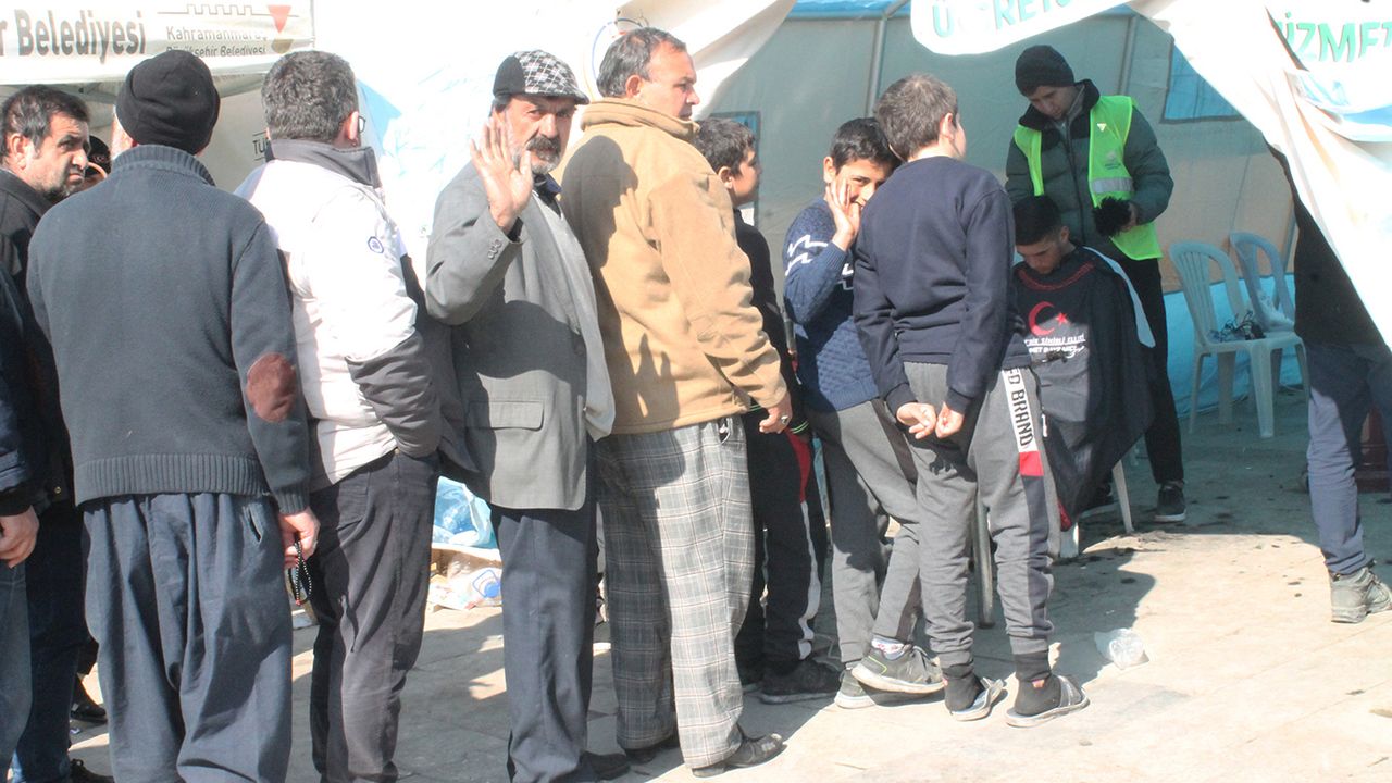 Tıraş olmak için gönüllü berber çadırlarının önünde uzun kuyruklar oluşuyor. İş yerinin depremden zarar gördüğünü belirten Kahramanmaraşlı berber Mehmet Bayrakçı, Sakarya"dan gelen gönüllü berberlerle birlikte çalıştığını söyledi.