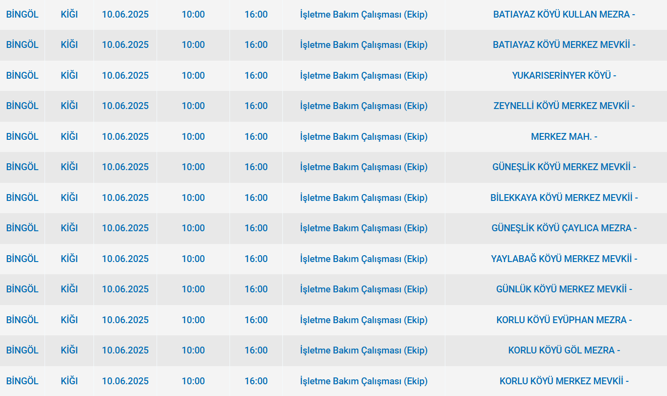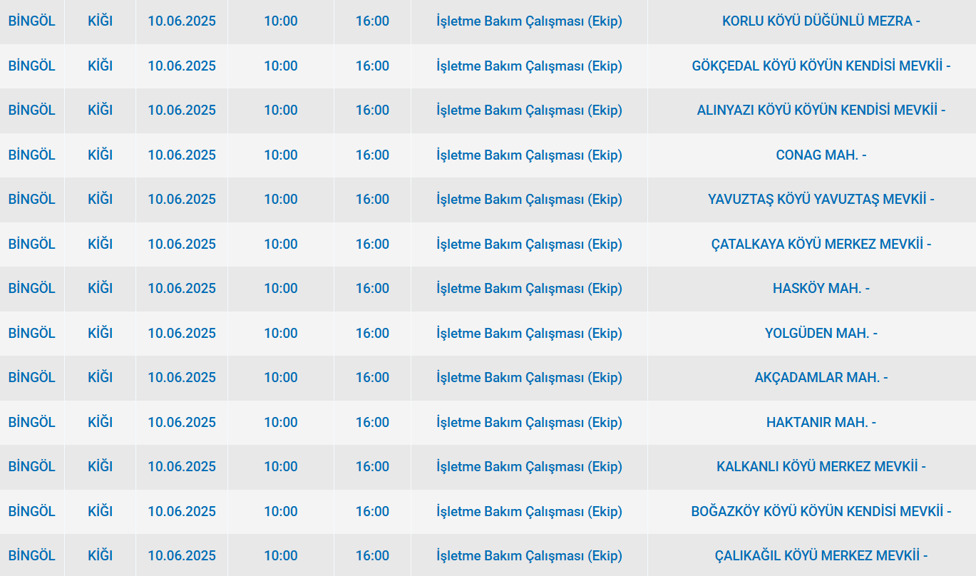 FIRATEDAŞ, Bingöl'ün 10 haziran 2025 salı günü bazı mahallelerde programlı bakım ve onarım faaliyetleri sebebiyle elektrik kesintisi olacağını ifade etti. Kesintiden etkilenecek ilçeler ve zaman dilimleri duyuruldu.