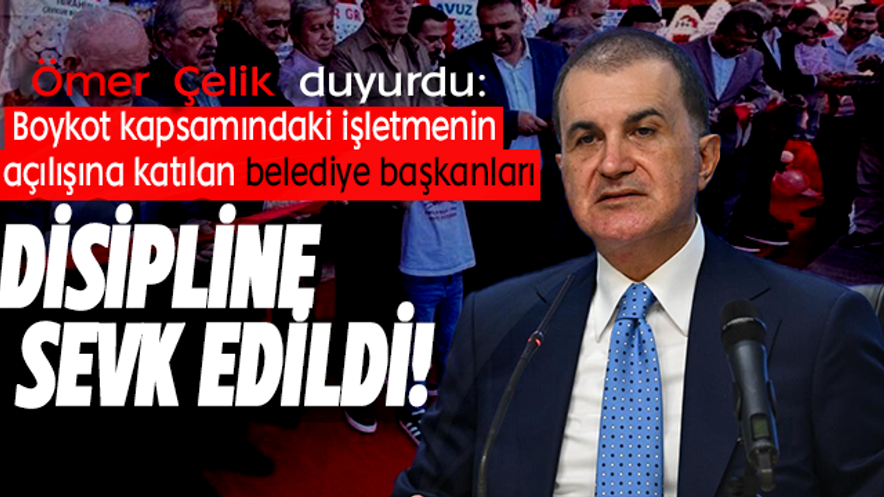 AK Parti Genel Başkan Yardımcısı ve Parti Sözcüsü Ömer Çelik, Rize'de boykot kapsamında olan bir işletmenin açılışına katılan belediye başkanları ve teşkilat yöneticileri hakkında disipline sevk kararı alındığını duyurdu.
