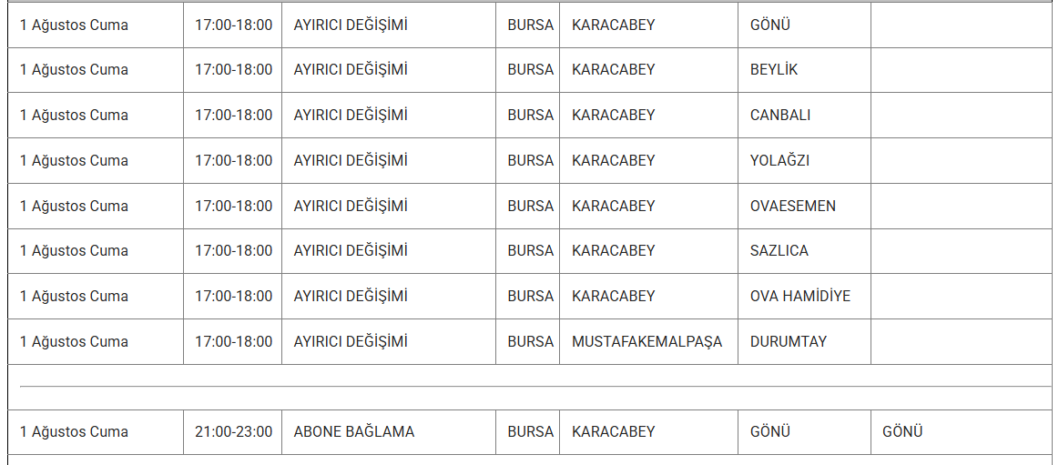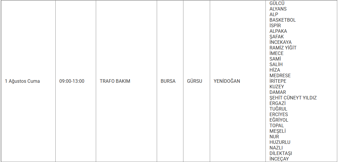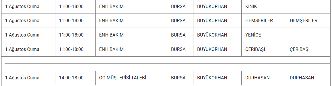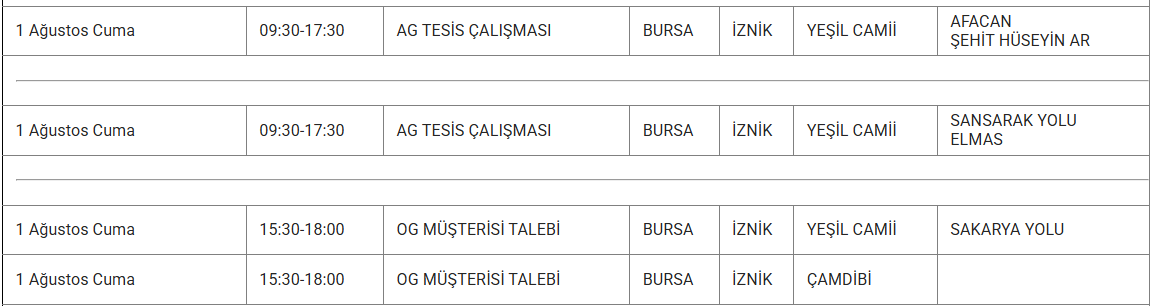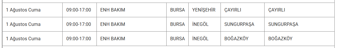 1 Ağustos tarihlerinde Bursa'nın Büyükorhan, Gemlik, Gürsu, İnegöl, İznik, Keles, Kestel, Mudanya, Mustafakemalpaşa, Nilüfer, Orhaneli, Orhangazi, Osmangazi, Yenişehir ve Yıldırım ilçelerinde elektrikler kesilecektir.