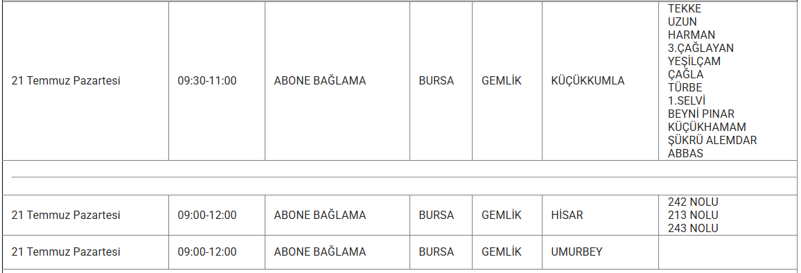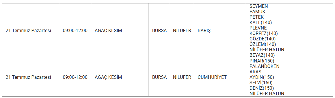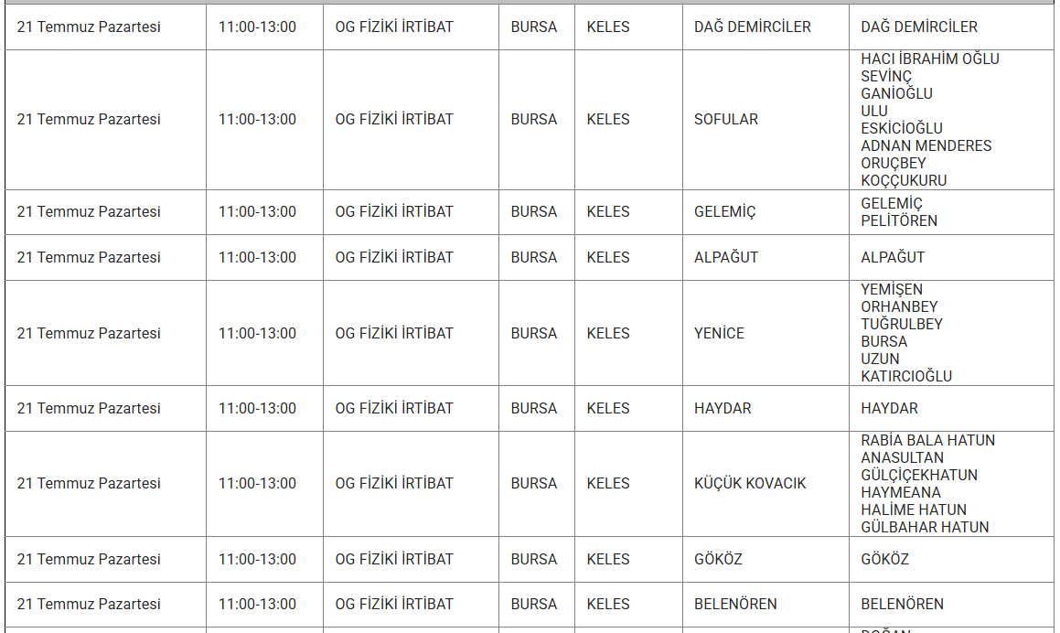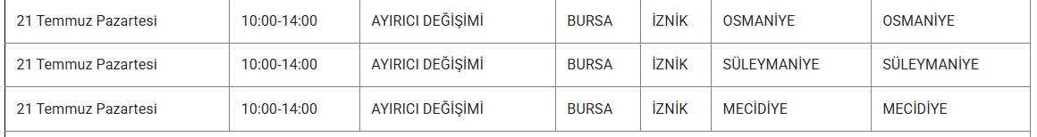 Ayrıca eskiyen elektrik hatları veya trafo arızaları da kesintilere yol açabiliyor. Uludağ elektrik gibi kuruluşlarda bu sorunları en aza indirmek için altyapı yenileme çalışmalarını sürdürdüğünü duyurdu. Işte 21 Temmuz günü Bursa'da planlı bakım ve onarım çalışmaları kapsamında elektrik kesintisi yaşanacak ilçe ve mahalleler..