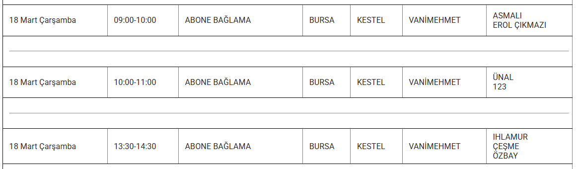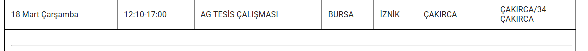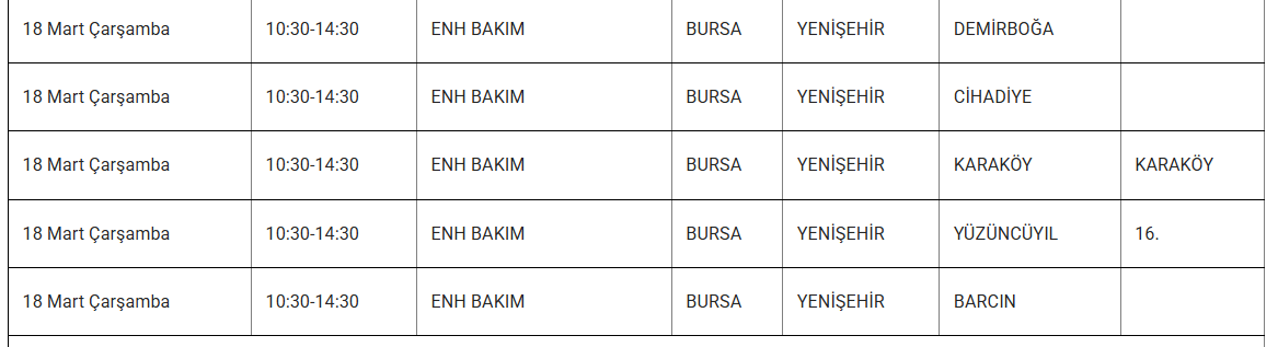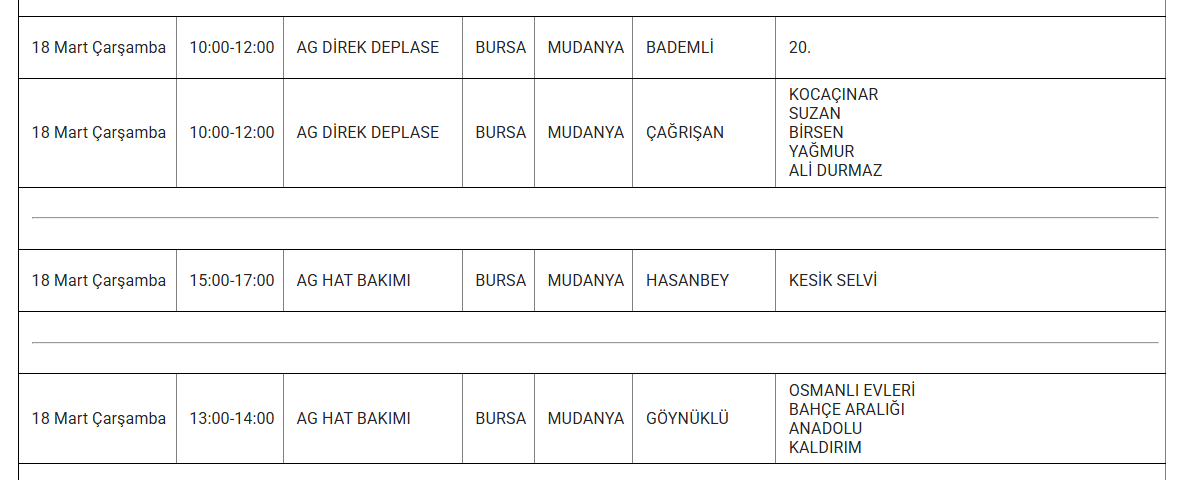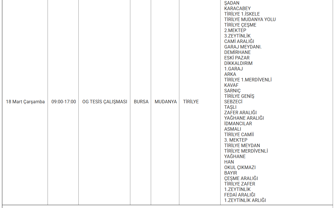 Uludağ Elektrik Dağıtım A.Ş. (UEDAŞ), 18 mart tarihli elektrik kesintisi programını paylaştı. Programda yer alan bilgilere göre İnegöl, İznik, Keles, Nilüfer, Mustafakemalpaşa, Orhangazi, Osmangazi ve Yıldırım ilçelerinde çeşitli mahalle ve bölgeler elektrik kesintisinden etkilenecek.