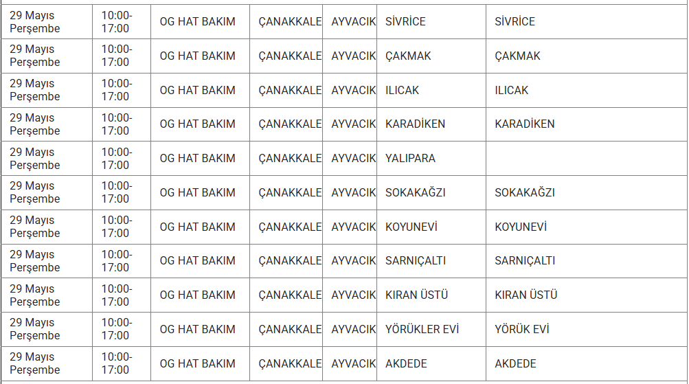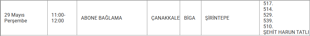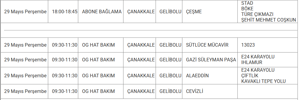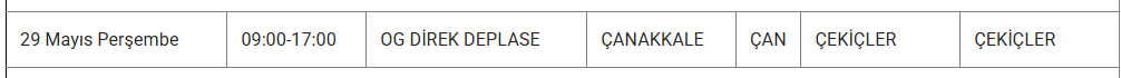 ÇANAKKALE 29 MAYIS ELEKTRİK KESİNTİSİ