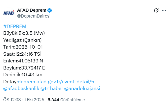 Son dakika Çankırı Ilgaz'da 3.5 büyüklüğünde bir deprem meydana geldi.