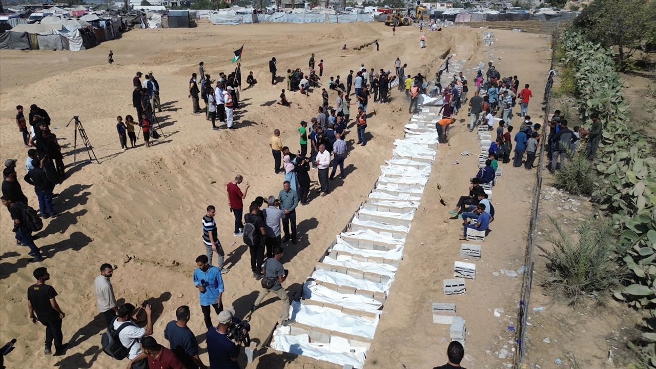 Gazze Şeridi'nde ateşkes ve esir takası anlaşması kapsamında, siyonist rejim tarafından naaşları teslim edilen ve kimlikleri tespit edilemeyen 54 Filistinli için Han Yunus'taki Nasır Hastanesi önünde cenaze merasimi yapıldı.
