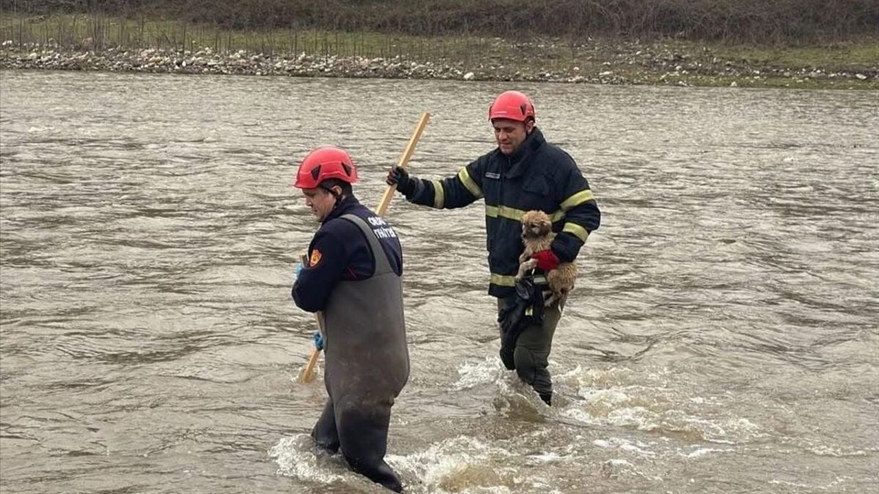 Çamaş ilçesine bağlı Edirli Mahallesi'nde debisi yükselen dere yatağında mahsur kalan köpeği fark edenler durumu itfaiye ekiplerine bildirdi.