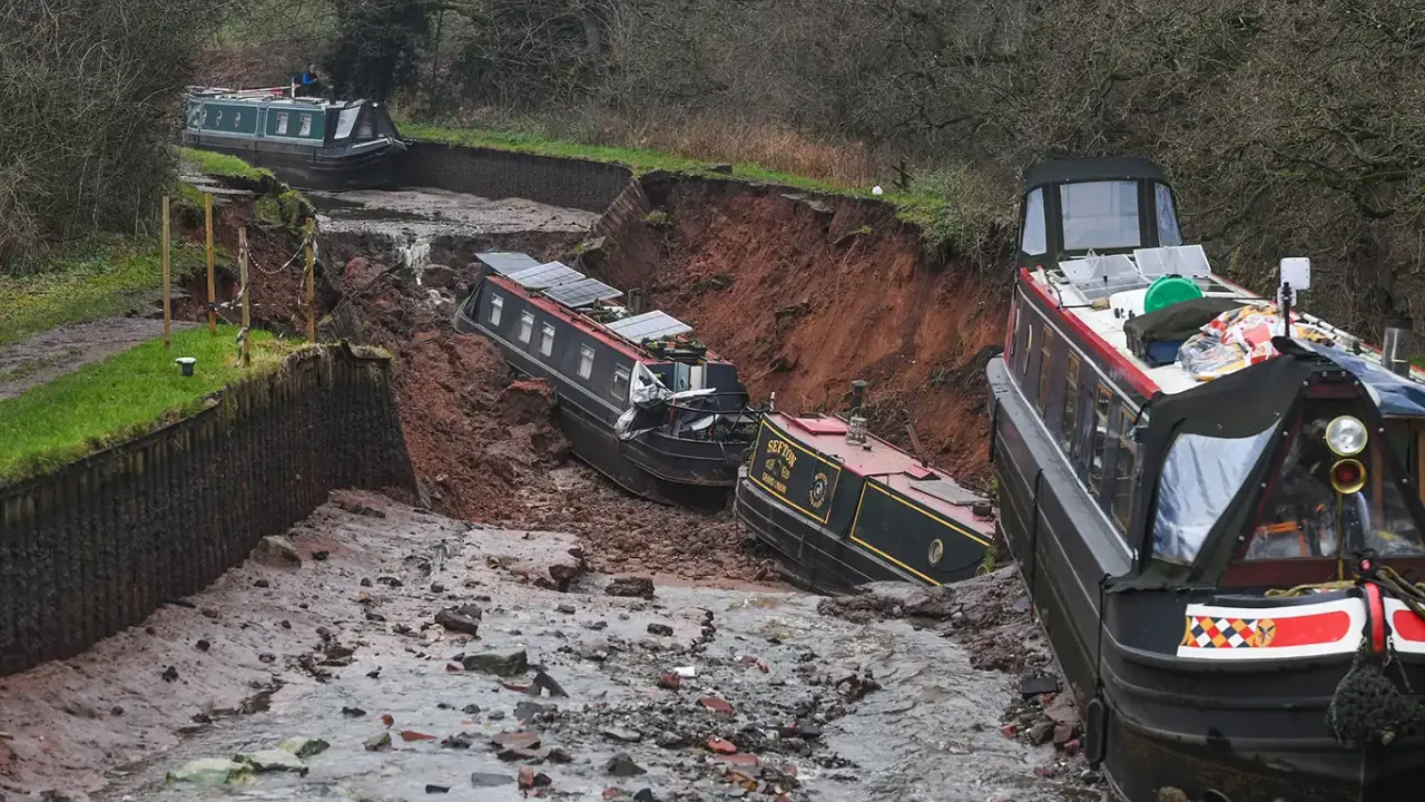 West Midlands bölgesinde bulunan Shropshire Kanalı'nda set çökmesi sonucu devasa bir obruk oluştu.
