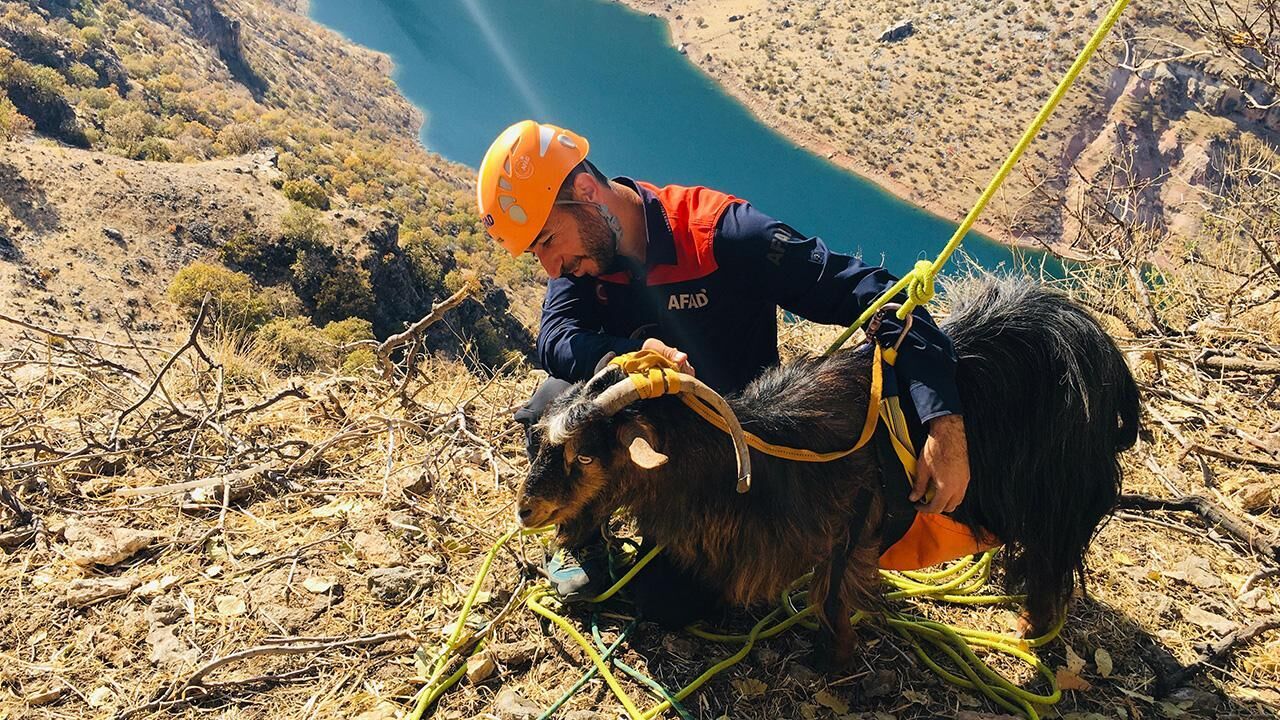 Ekipler halat yardımıyla kayalıklardan inerek, 10 keçiyi bulundukları yerden yine halatla çıkardı.