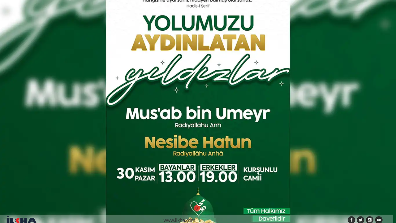 "İçinde yaşadığımız bu çağda özellikle hem gençliğimizde hem de tüm insanlarda gerçekten ciddi bir yozlaşma, dinden uzaklaşma ve dünyevileşme var. Bizler bu dünyevileşme ve yozlaşmadan kurtuluşun yegâne yolunun Peygamber Efendimiz Sallallahu Aleyhi Vesellem ve onun kutlu sahabelerinin yolu ve örnekliğinde kurtulacağımıza inanıyoruz. Bu meyanda pazar günü Kurşunlu Camii'nde saat 13.00'de bayanlara yönelik olarak Nesibe Hatun Radiyallahu Anhume'nin hayatını anlatan, akşam 19.00'da ise erkeklere yönelik Musab Bin Umeyr Radiyallahu Anhume'nin hayatını anlatan program düzenlenecek."
