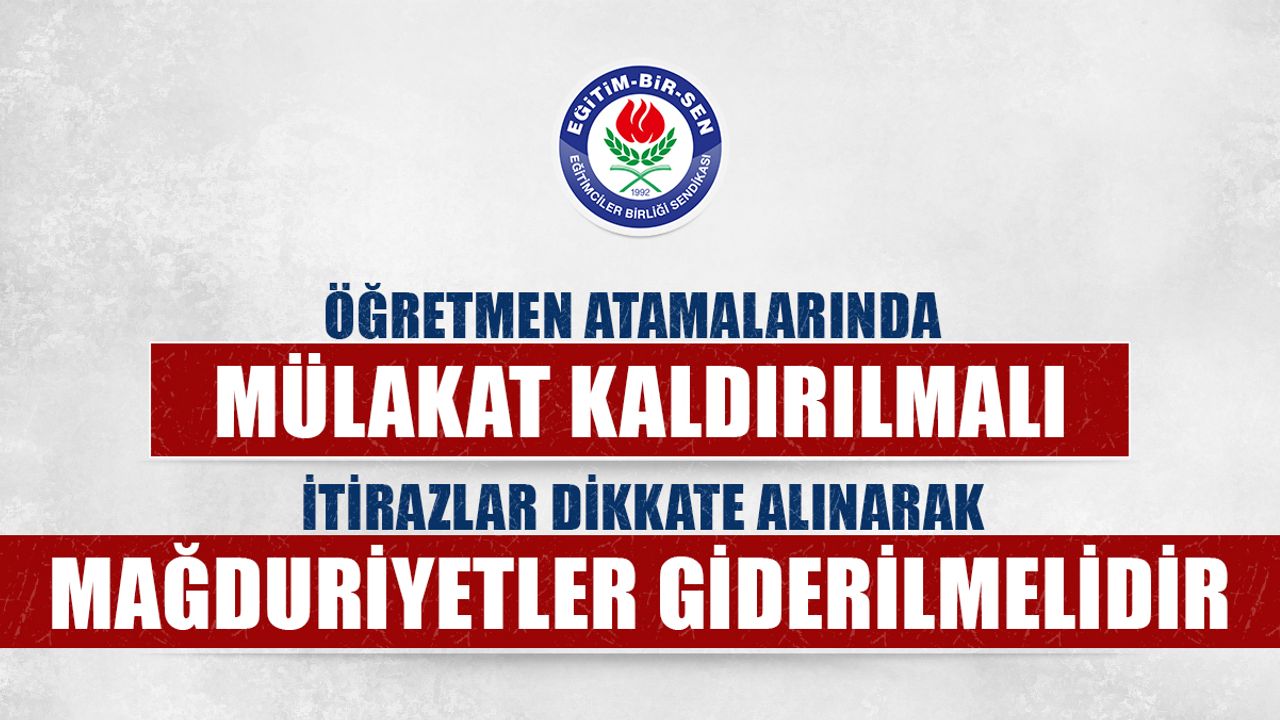 Bu bağlamda, öğretmen adaylarına bilgi edinme hakkı ve hak arama özgürlüğü çerçevesinde, gerek güvenlik soruşturması eksenindeki idari kararlara gerekse mülakat sonuç ve gerekçelerine dair yargı denetimine elverişli bir bilgilendirme yapılması gereklidir. Eğitim-Bir-Sen olarak, ilk günden itibaren itiraz ettiğimiz sözleşmeli öğretmenlik ve mülakat uygulaması, Meclis'e sevk edilen Öğretmenlik Meslek Kanunu'nda yapılacak düzenlemeyle yürürlükten kaldırılmalıdır. Mülakat uygulamasından kaynaklanan şikâyetler gündeme alınmalı, öğretmen adaylarının itirazları bir an önce neticelendirilmeli, sosyal hukuk devletinin gereği yerine getirilmelidir."