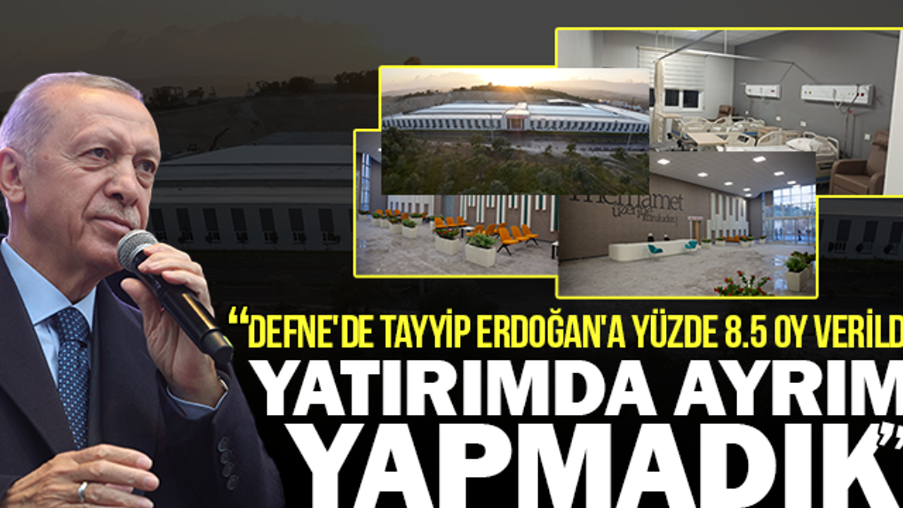 Cumhurbaşkanı Recep Tayyip Erdoğan, Hatay'da vatandaşlara seslendi. Erdoğan, Defne Hastanesi'nin yapımına dikkat çekerek, "Defne'de Tayyip Erdoğan'a verilen oy yüzde 8.5. Peki, bay bay Kemal'e verilen, 90.5. Kardeşlerim biz burada mezhebi bir ayrım var diye bu yatırımı yapmıyoruz. Burada bir deprem yaşadık. Bu ülkenin Cumhurbaşkanı bensem, orada yaşayan insan olduğuna göre yatırım yapmak zorundayız dedik ve talimatı verdik" dedi.