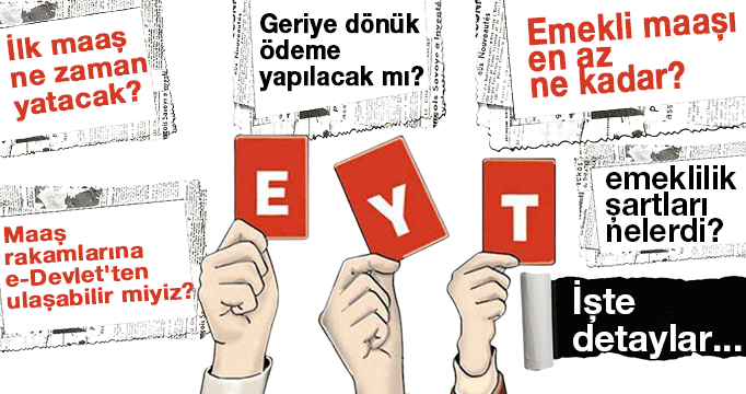 EYT'liler diğer emeklilerle aynı şartlarda ödeme alacak. Farklı bir uygulamaya maruz kalmayacaklar. Emekliler en az 5 bin 500 lira maaş aldıkları için EYT'lilerin de maaşları en az bu rakam olacak.