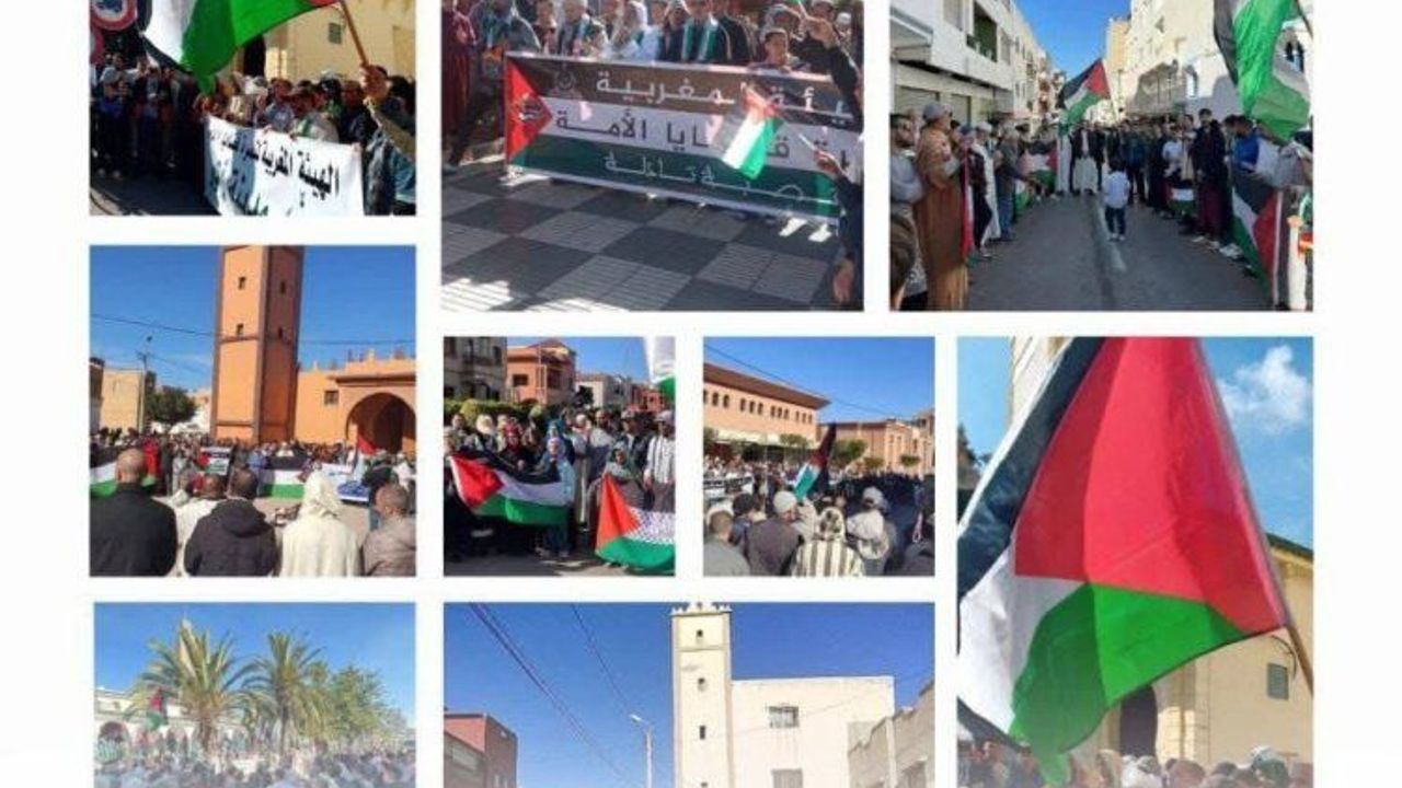 Fas Ulusun Davalarını Destekleme Heyeti"nin çağrısına cevap veren Faslılar, bugün 56 Fas şehrinde 115 gösteri düzenledi. Bu gösteriler, "El-Aksa Kasırgası Cuması" adıyla 66. kez, yüce Allah'ın şu buyruğu altında gerçekleştirildi: