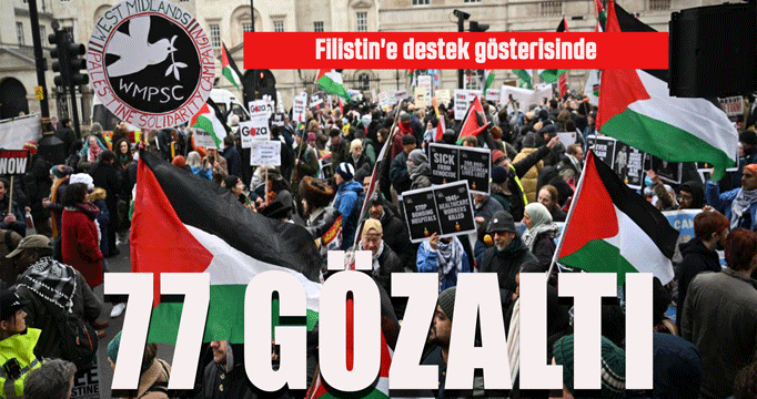 Londra Metropolitan Polisi, yaptığı açıklamada, Filistin destekçilerinin Başbakanlık Ofisi'nin de bulunduğu Whitehall Caddesi'nde düzenlediği gösteri ve sonrasındaki yürüyüşte 77 kişinin gözaltına alındığını bildirdi.