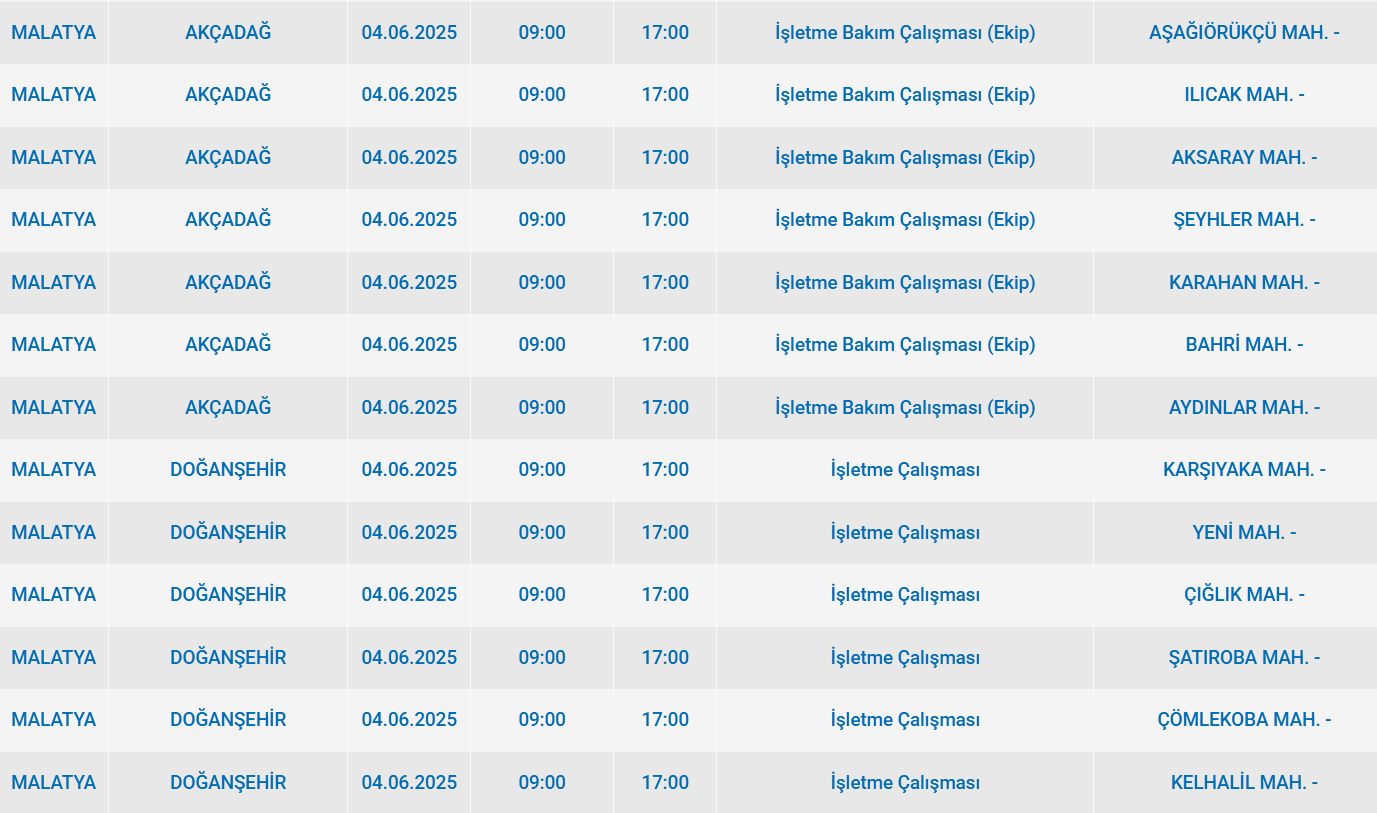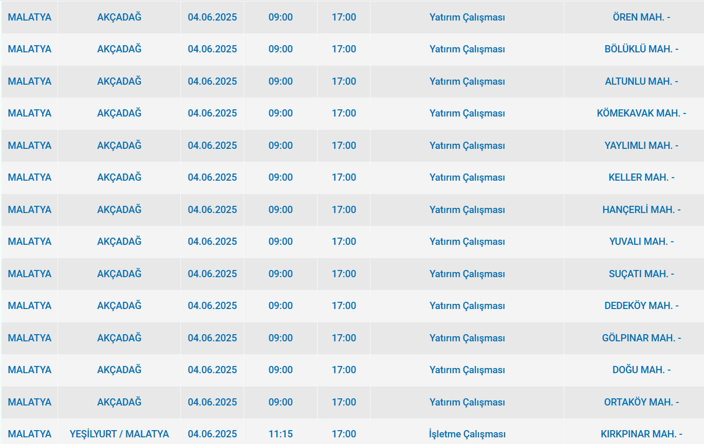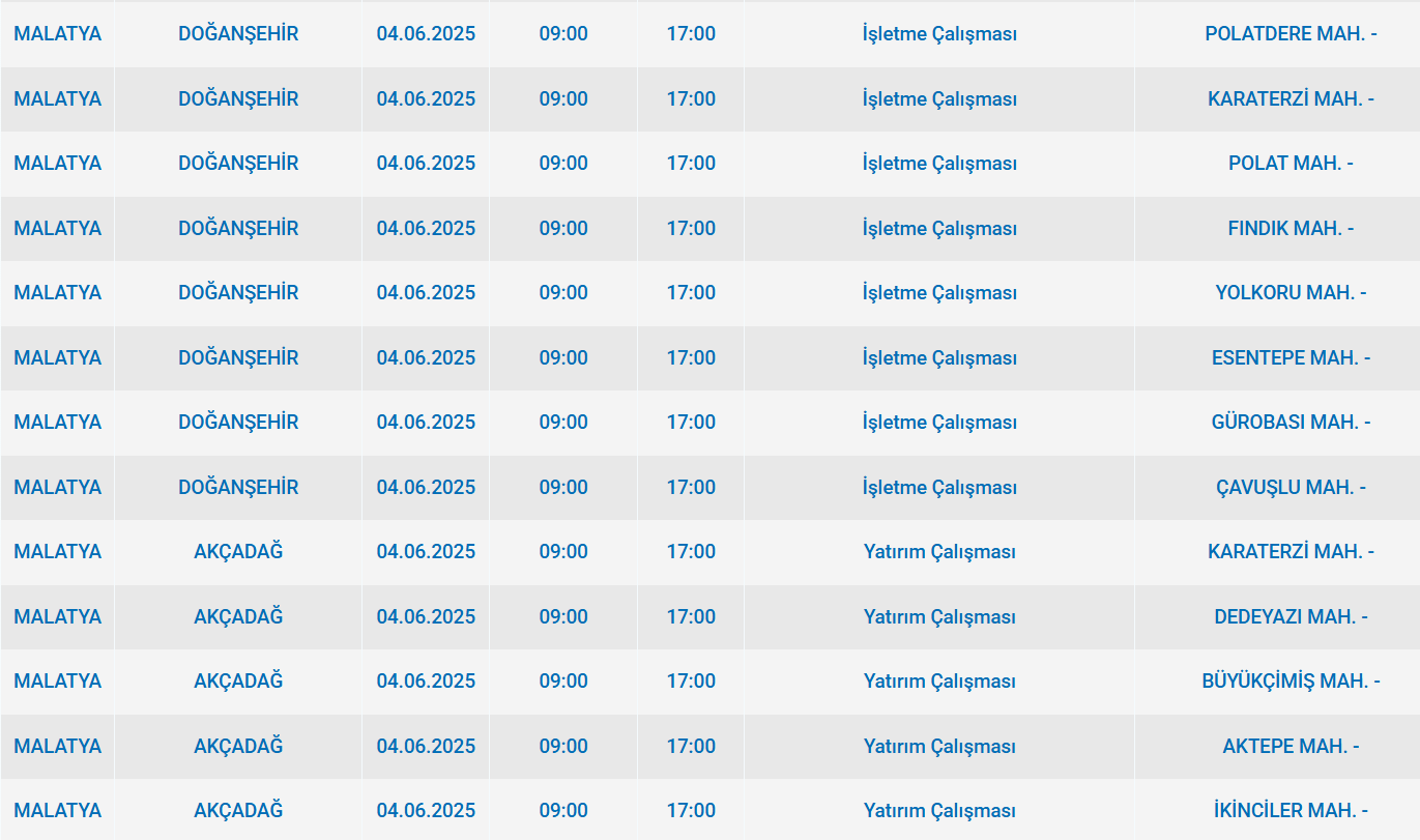 4 Haziran Çarşamba sabahı Malatya'da başlayan elektrik arızası, pek çok semti etkileyecek. Fırat edaş’tan resmi bir duyuru henüz yapılmazken, halk kesintinin bir an önce sona ermesini bekliyor. İşte Malatya'da elektriğin kesileceği alanlar:
