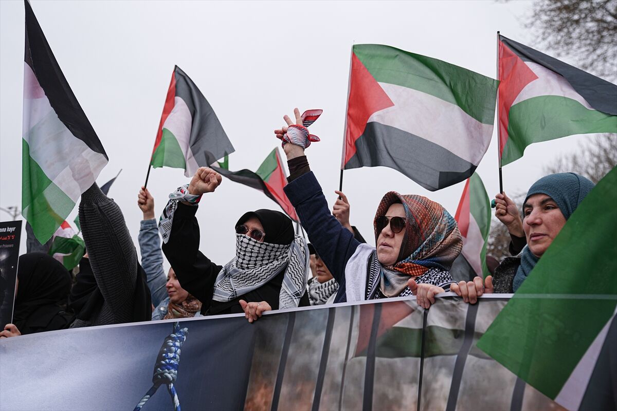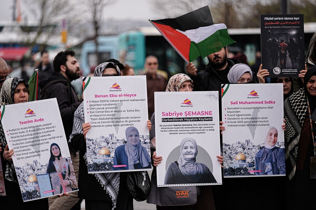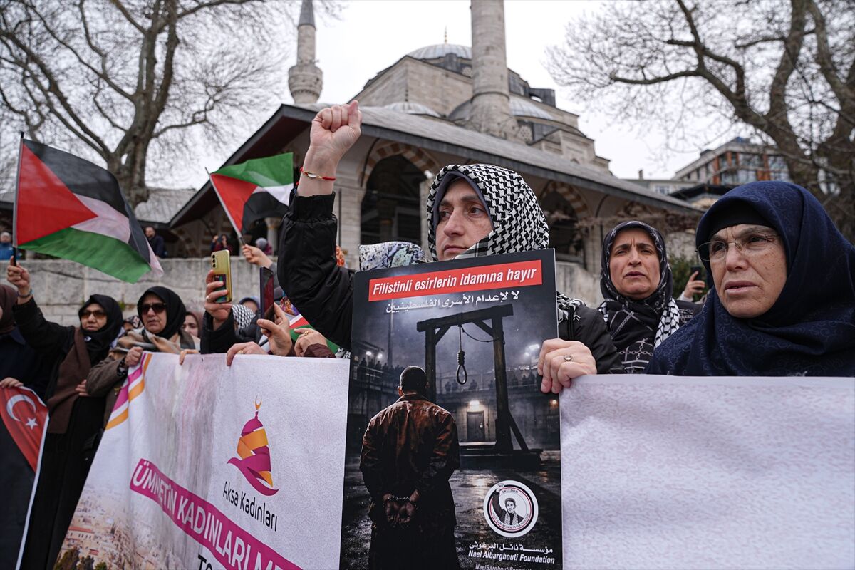 Cuma namazının ardından Üsküdar'daki Mihrimah Sultan Camisi'nin önünde bir araya gelen dernek üyeleri, döviz ve pankartlar taşıyarak Siyonist rejimin katliamları ve esirler için çıkarılan idam yasası aleyhine slogan attı.