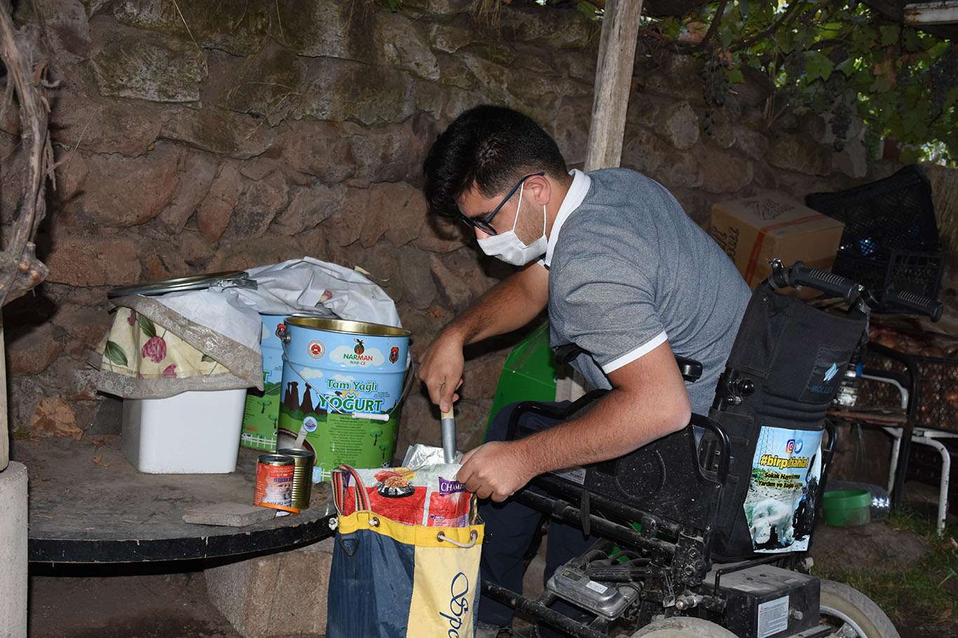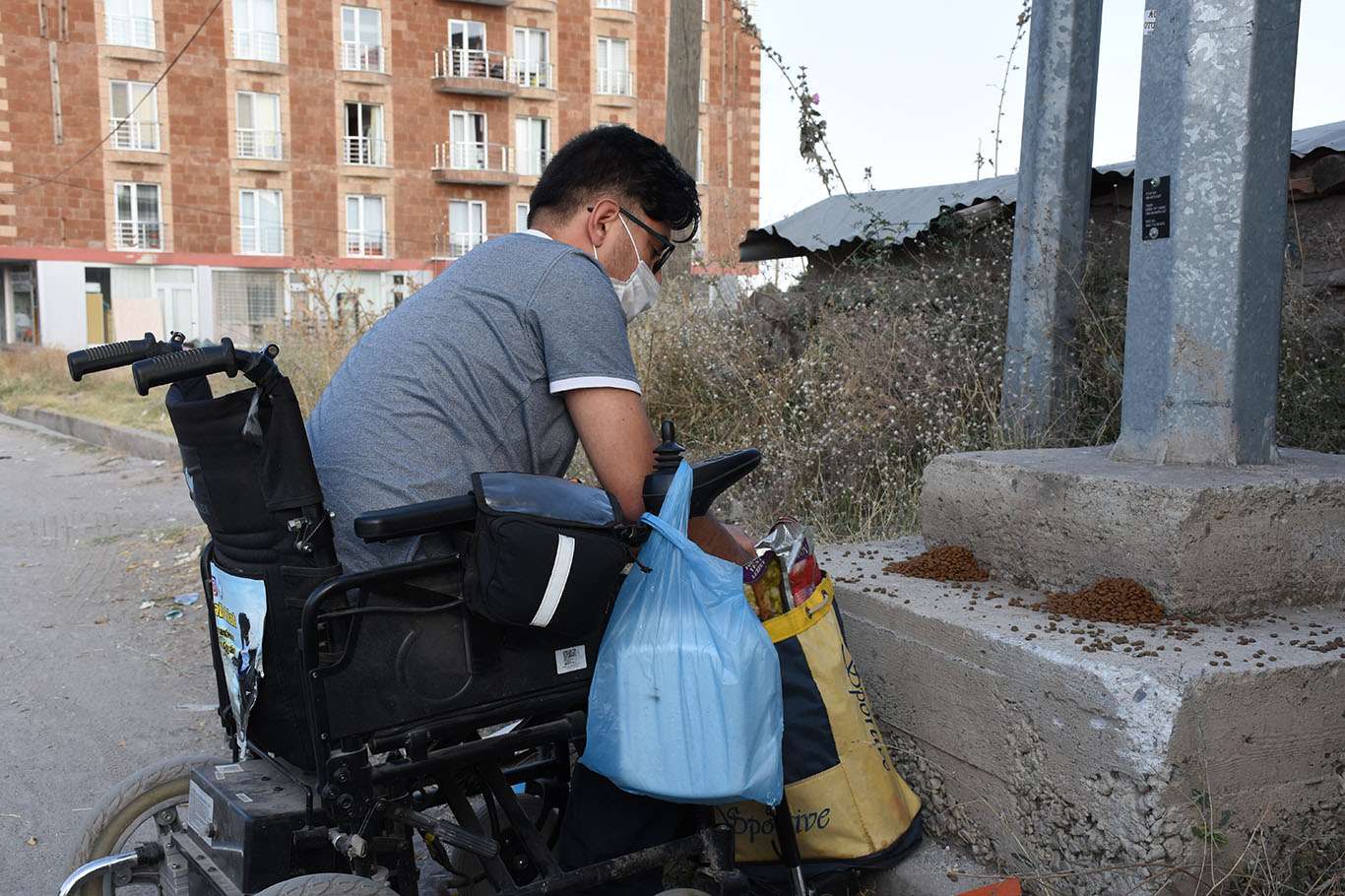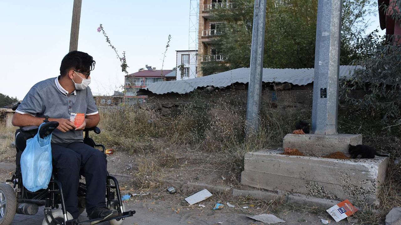 Bedensel engelli genç, akülü aracıyla her gün sokak hayvanlarının karnını doyuruyor