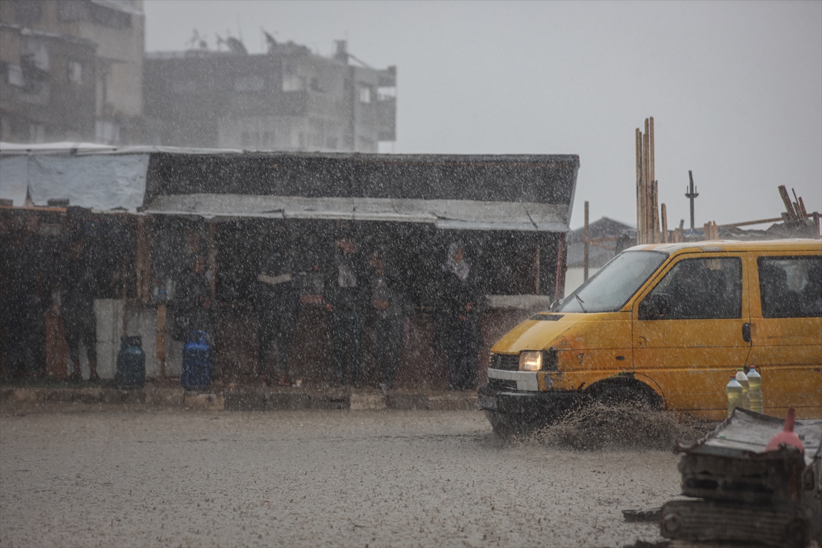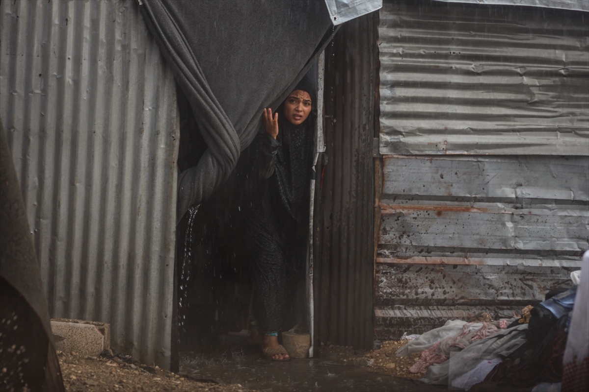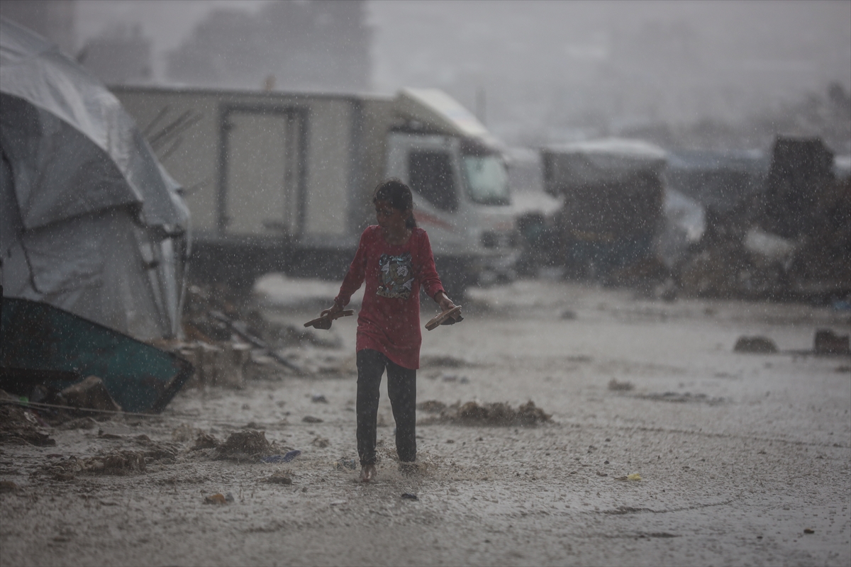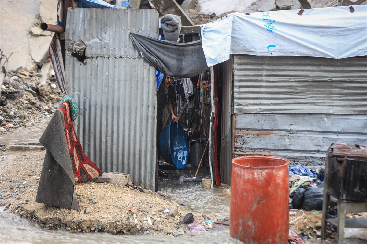 Yağış sonrası su ve çamur birikintilerinin oluştuğu bölgede, İsrail'in saldırıları nedeniyle evleri yıkılan Filistinliler kötü hava koşullarıyla da mücadele ediyor.