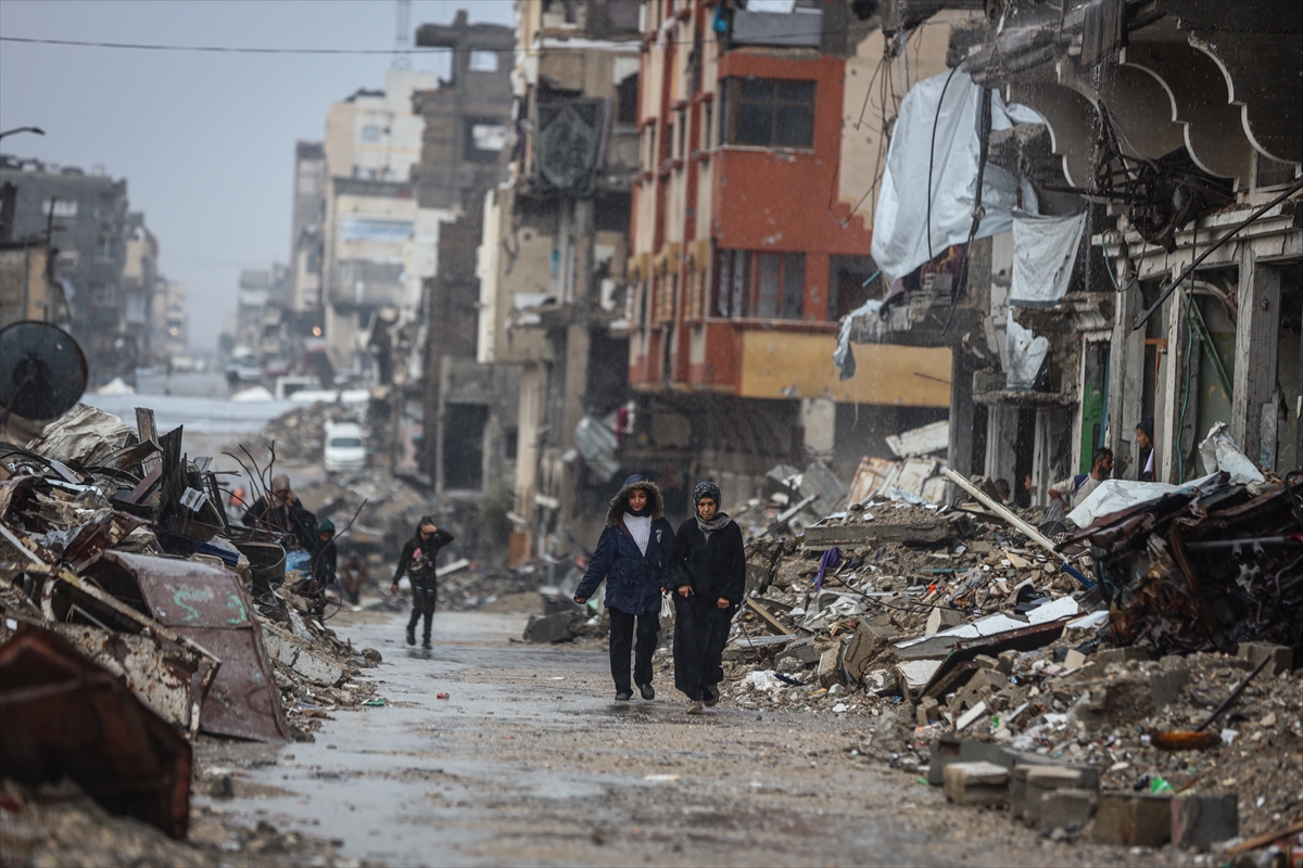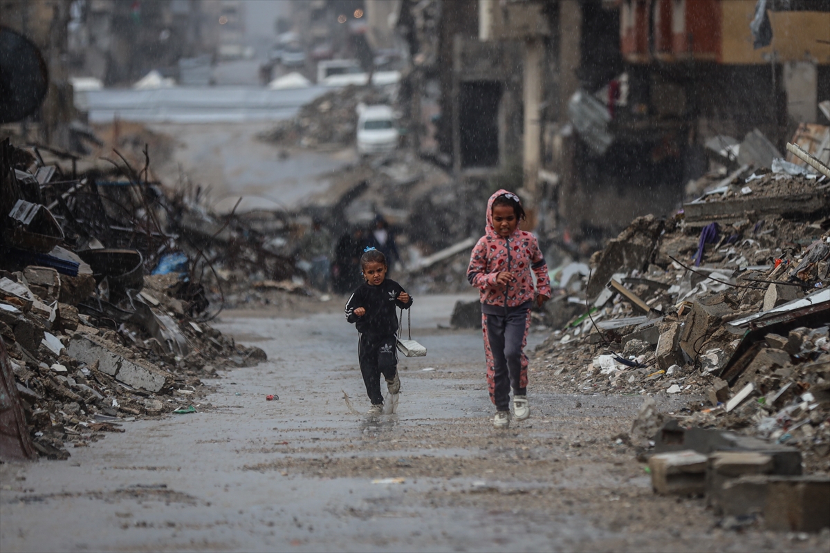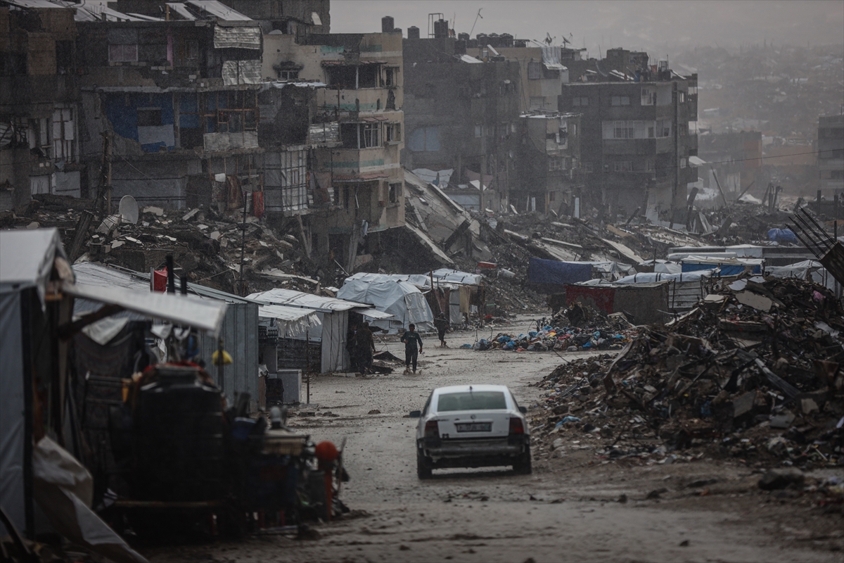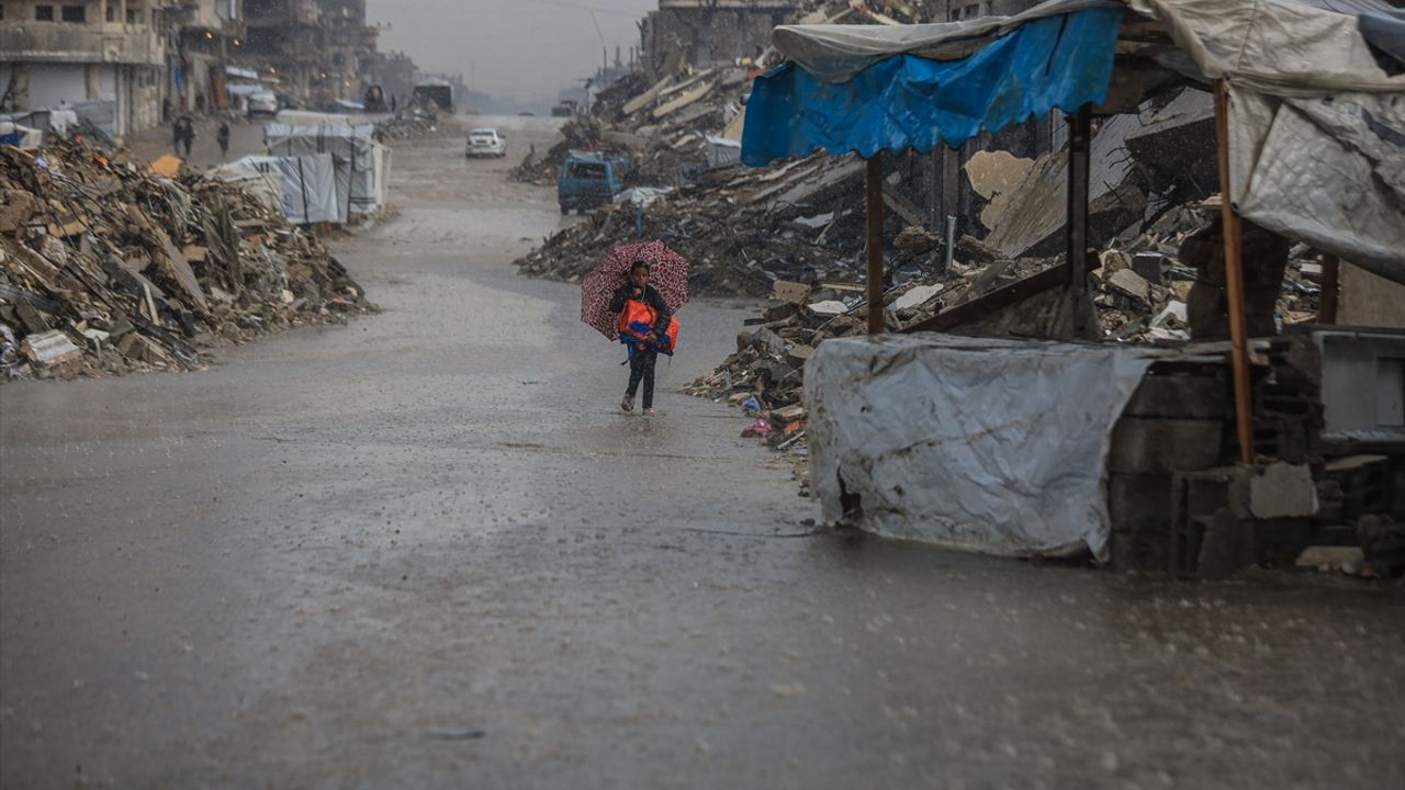 Yağış sonrası su ve çamur birikintilerinin oluştuğu bölgede, İsrail'in saldırıları nedeniyle evleri yıkılan Filistinliler kötü hava koşullarıyla da mücadele ediyor.