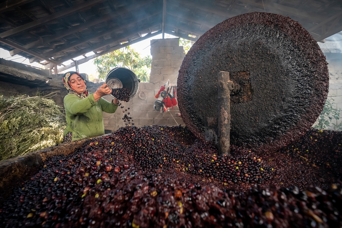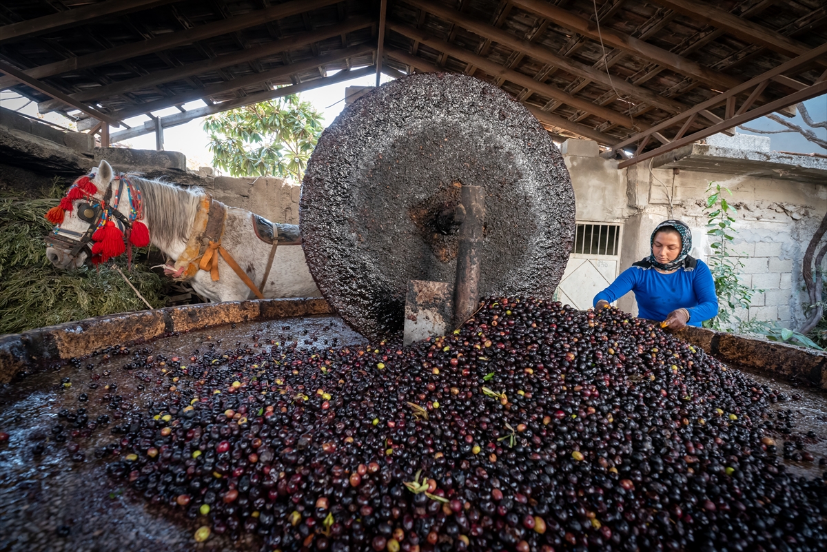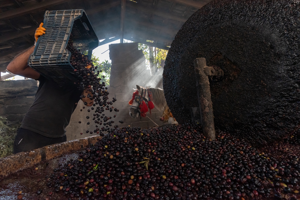 Taşta ezilen zeytin posası suyla karıştırılıyor