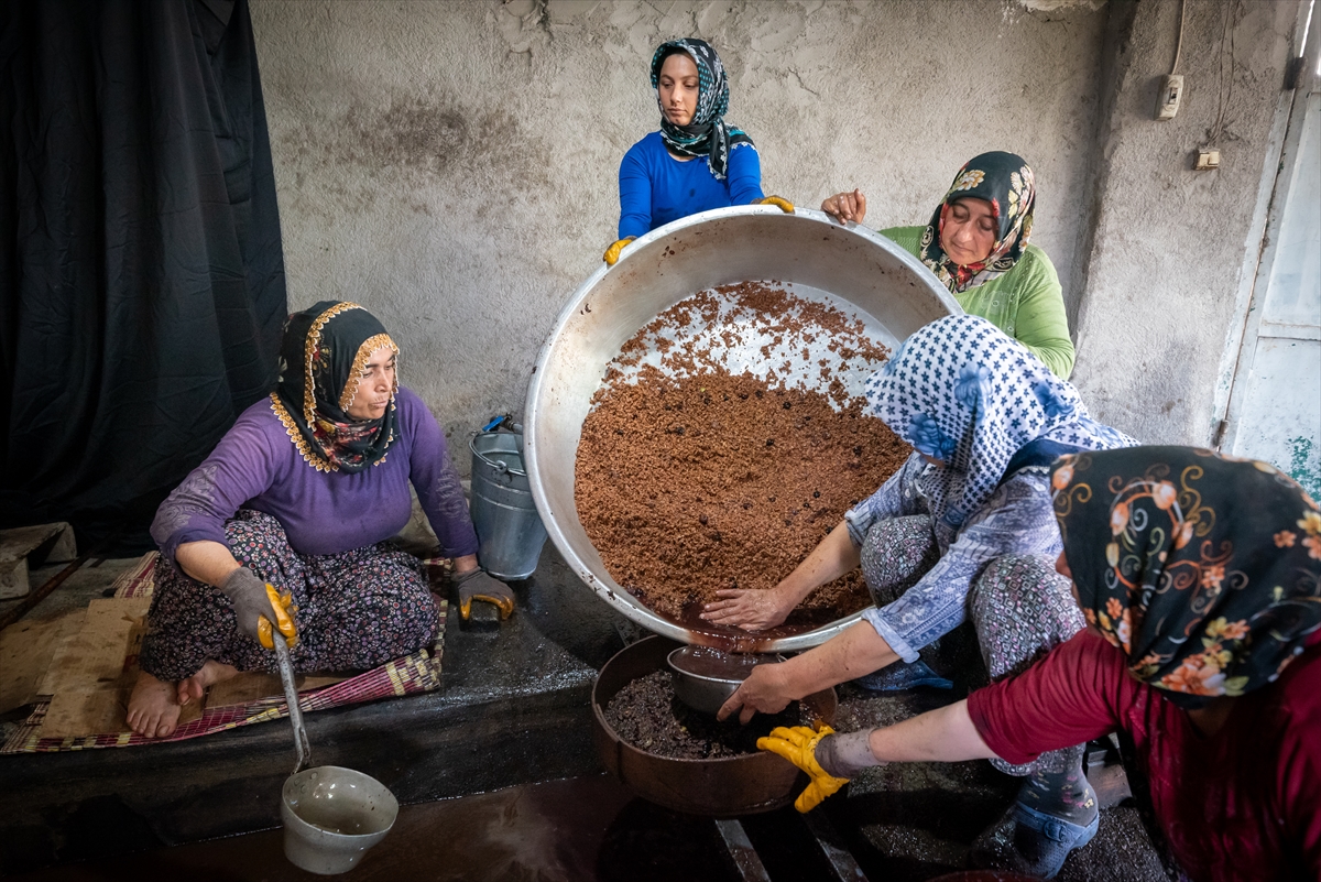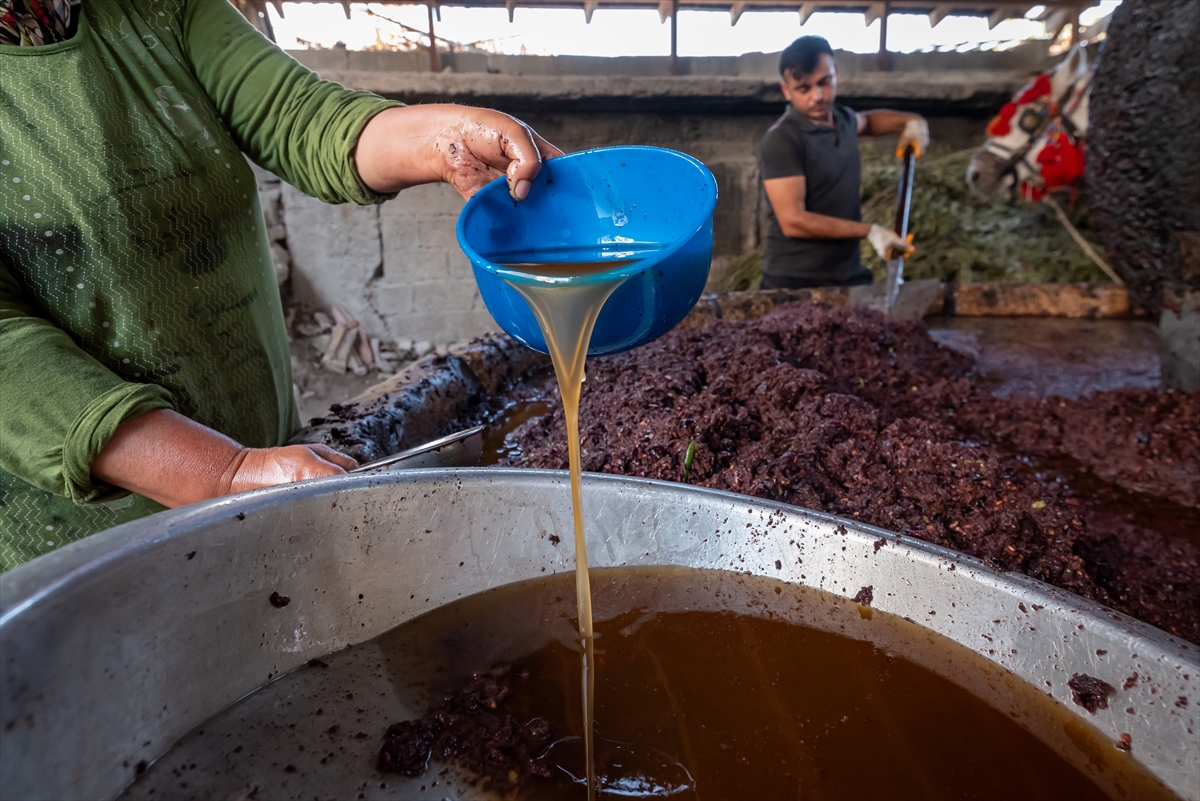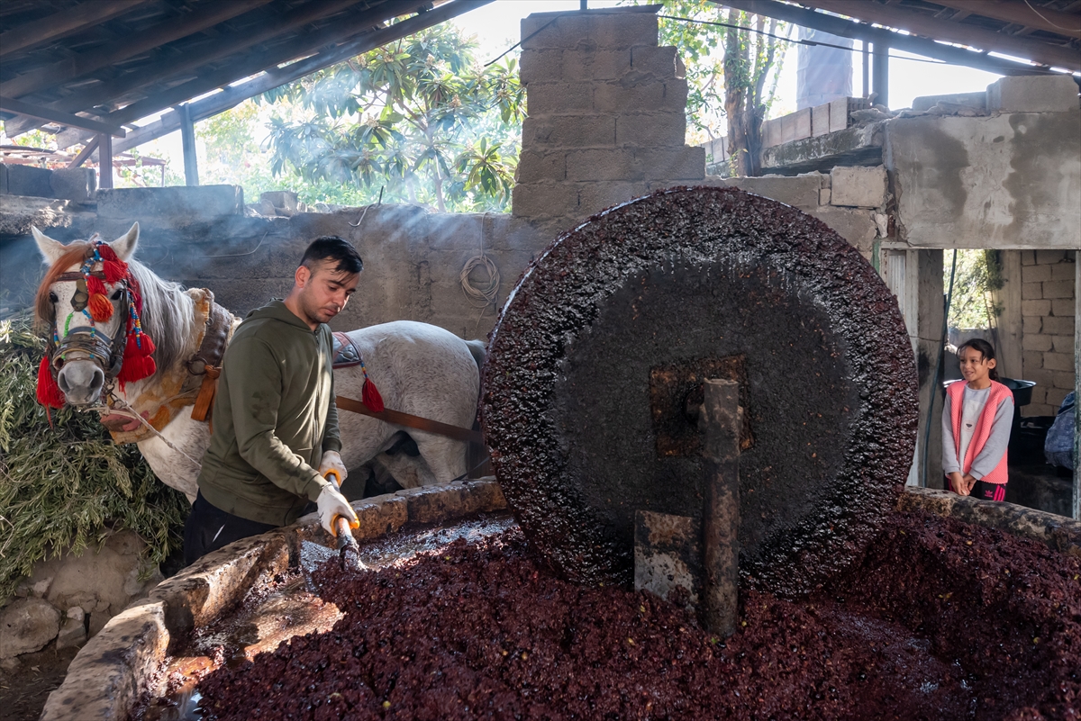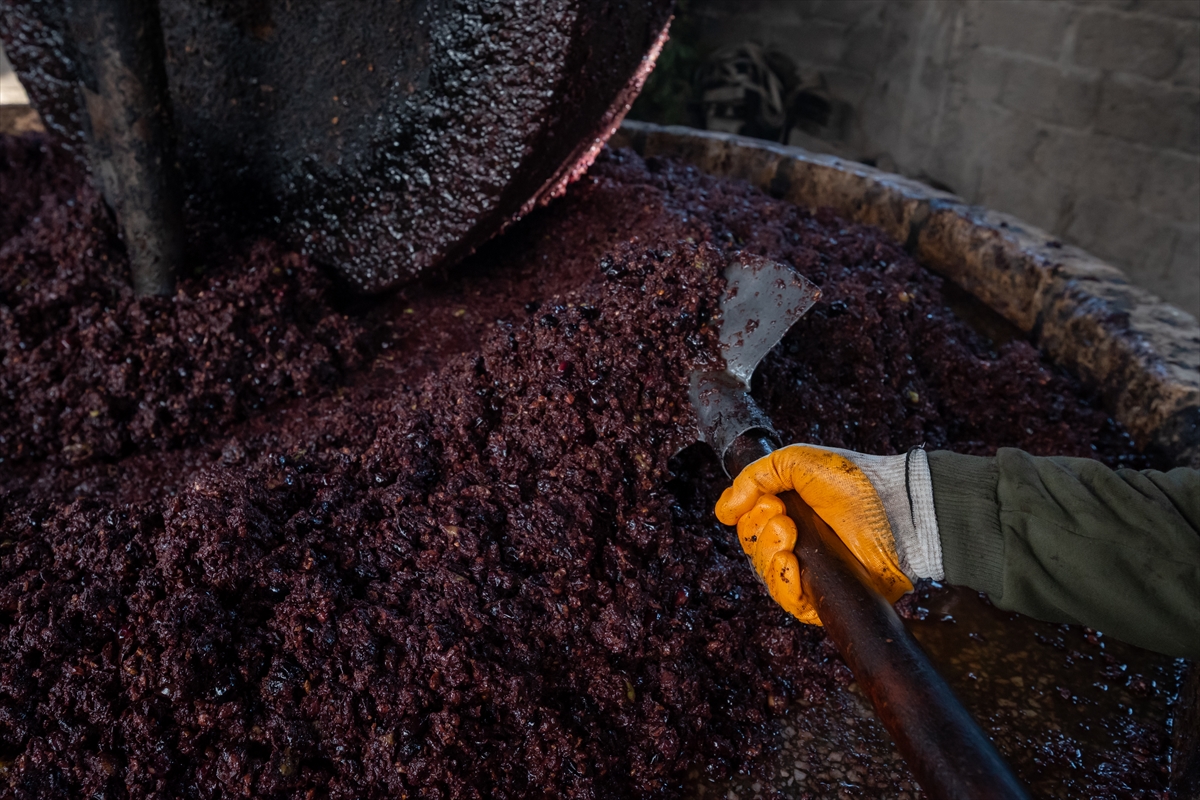 Taşta ezilen zeytin posası suyla karıştırılıyor