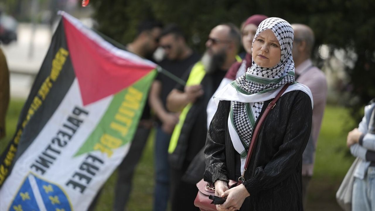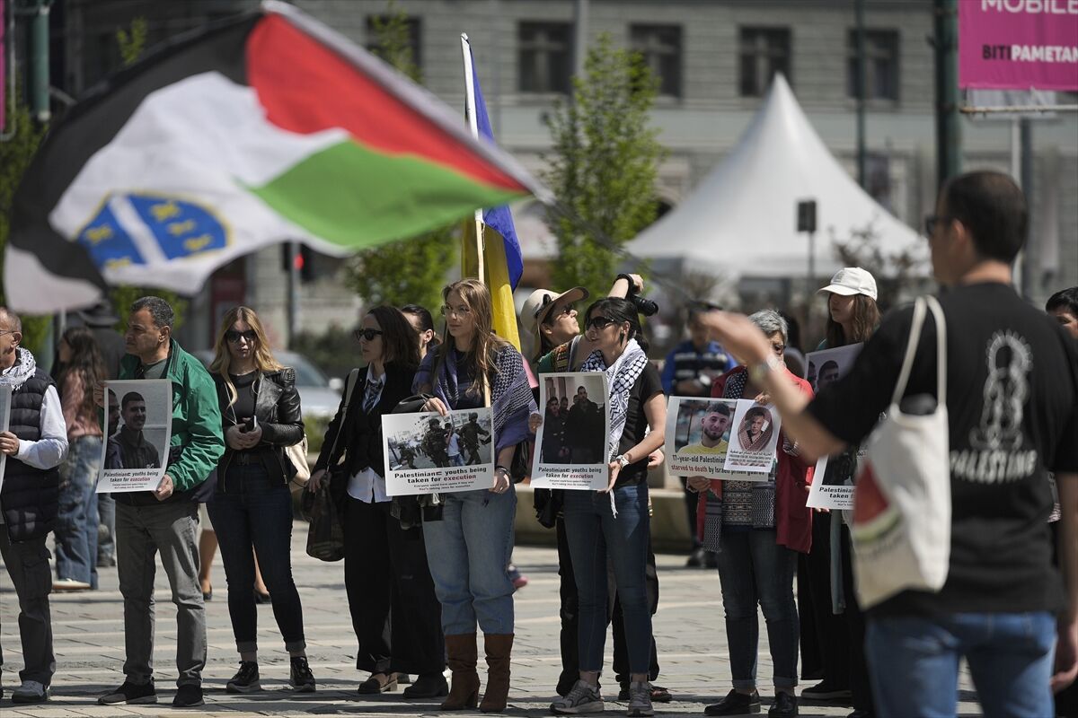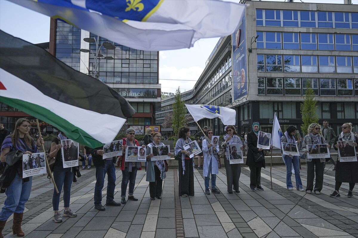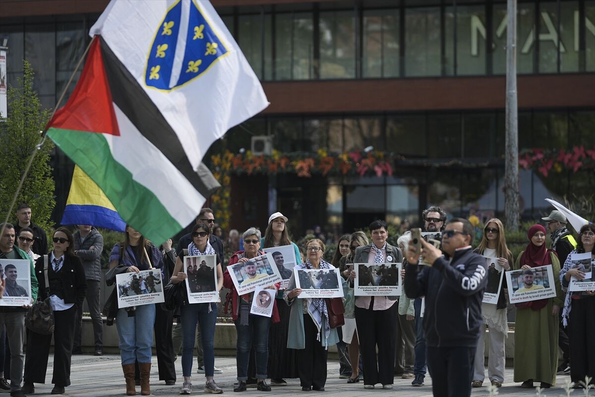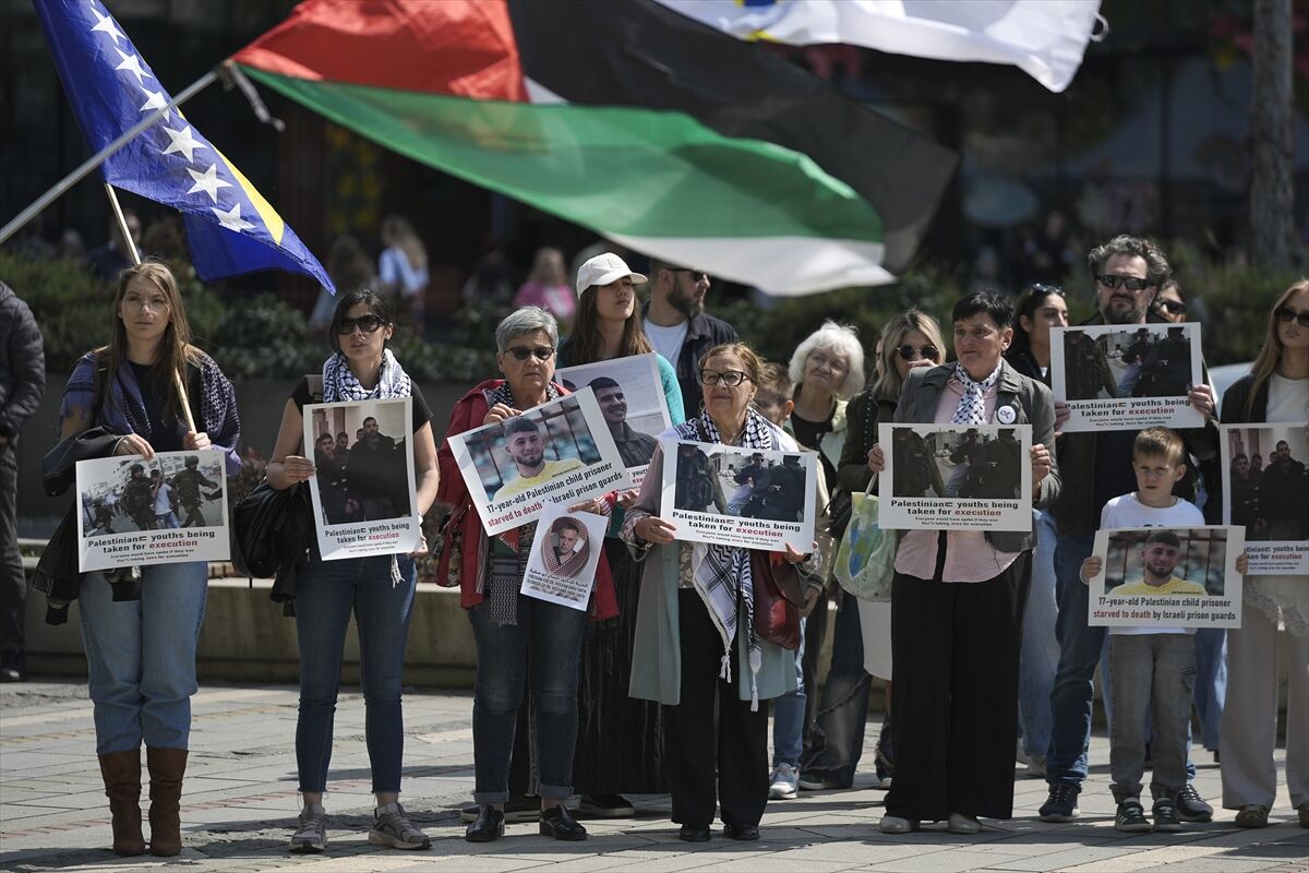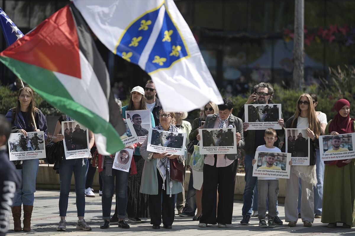 Filistinli esirlerin serbest bırakılması için Saraybosna'da Öldürülen Çocuklar Anıtı önünde toplanan Bosna Hersekliler, esirlerin fotoğraflarını taşıdı.