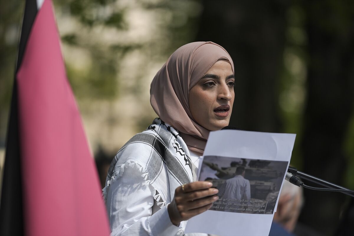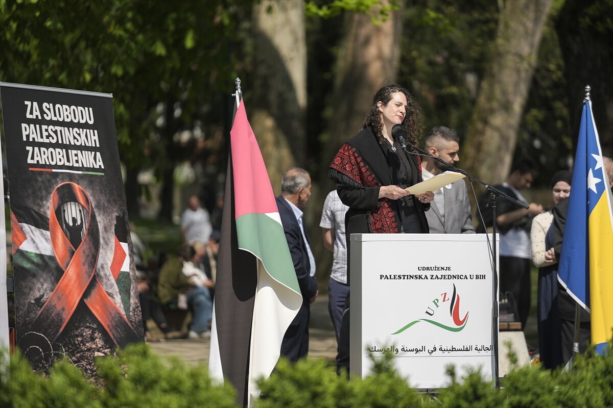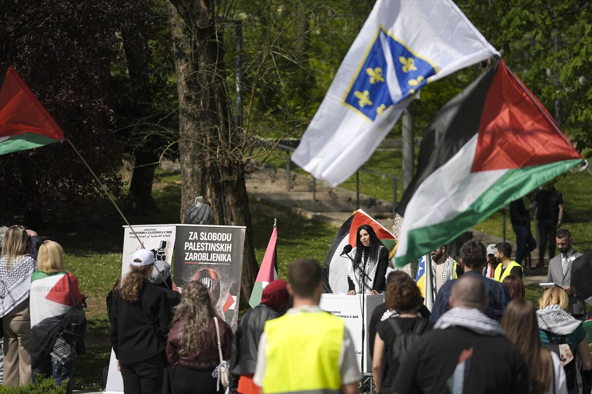 Gösteriye katılanlar, Filistin ve Bosna Hersek bayrakları açarak zulüm zindanlarında bulunan Filistinli esirlerin temel insan haklarının korunması çağrısında bulundu.