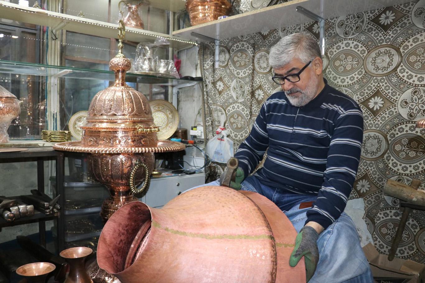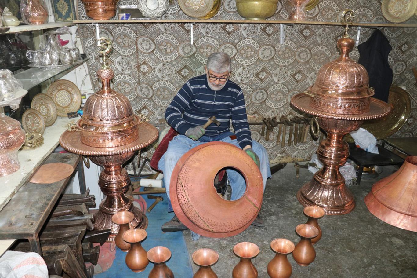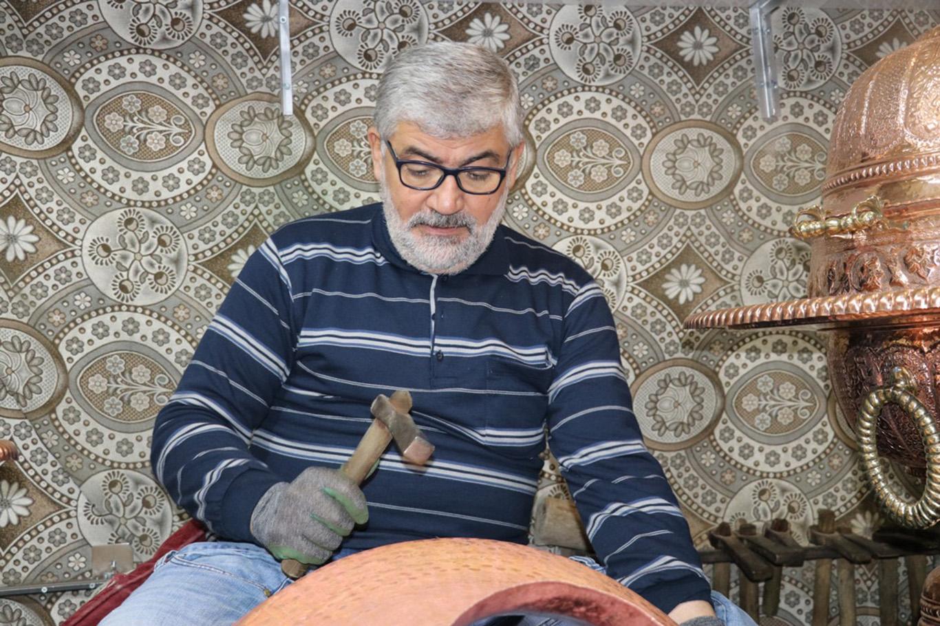 Suriyeli bakır ustası, mesleğini bakırcılığın merkezi Gaziantep'te sürdürüyor