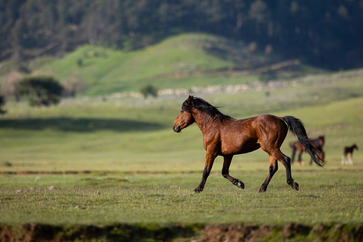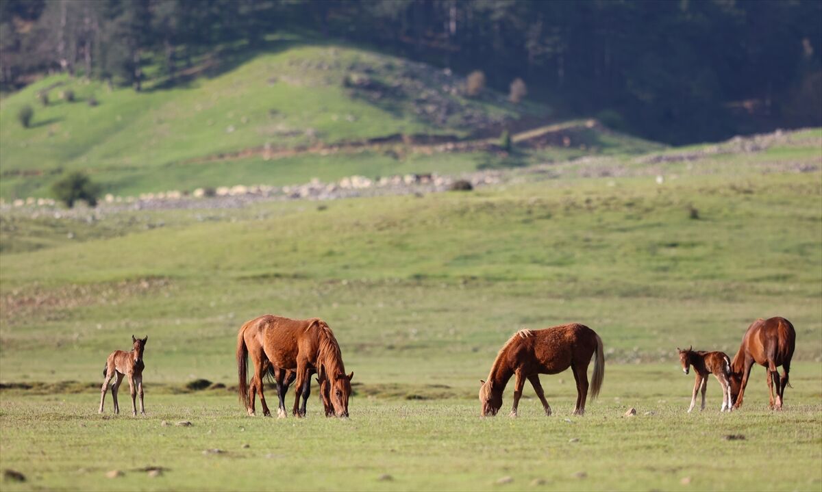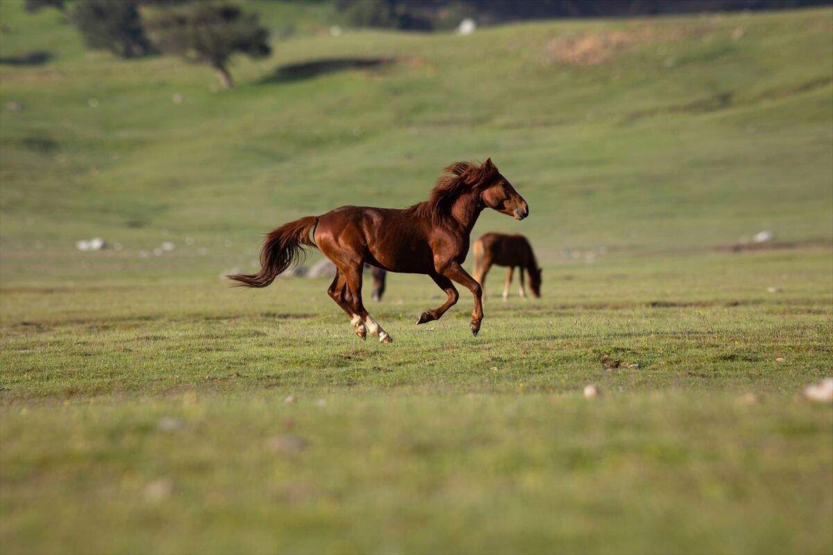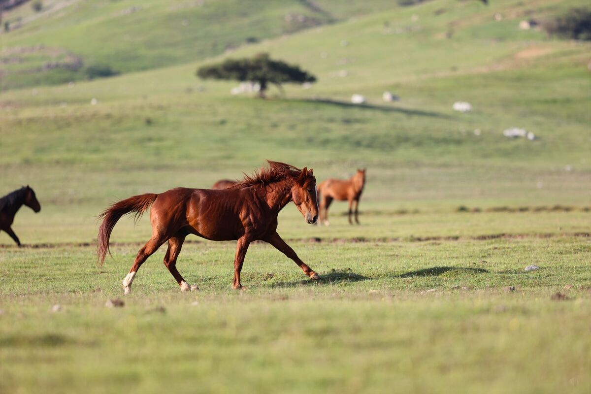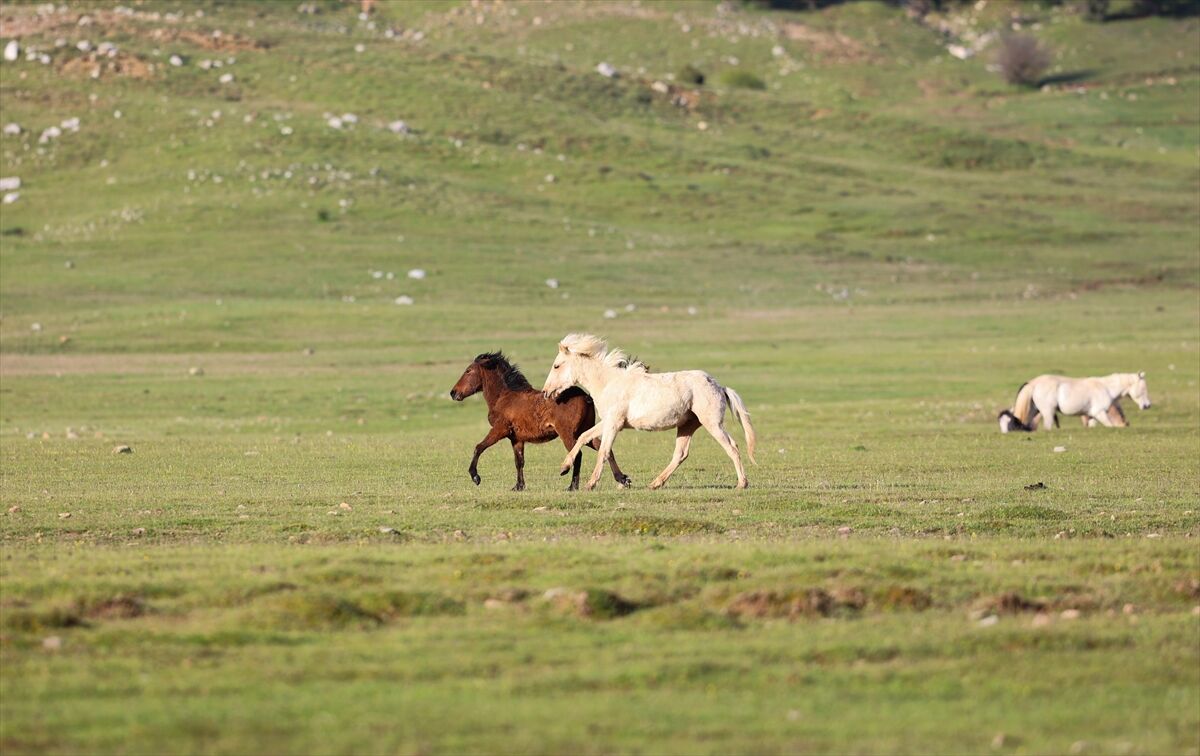Yeşile bürünen ovada sürüler halinde dolaşan yılkı atları renkli görüntüler oluşturuyor.