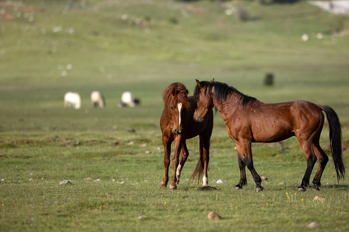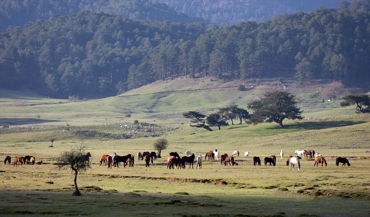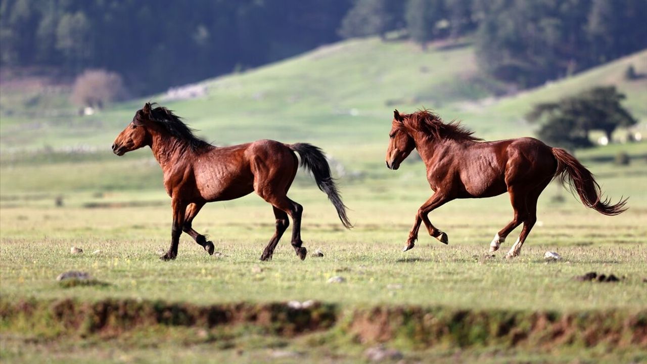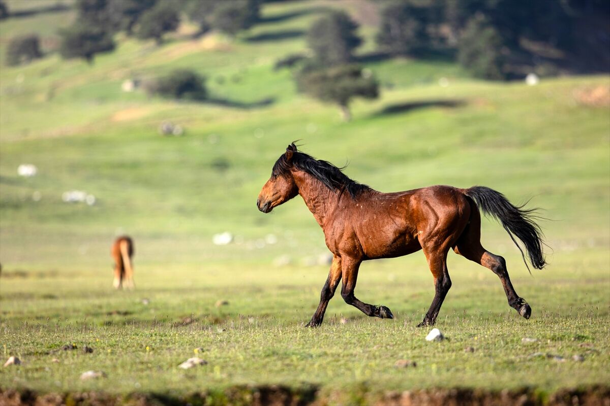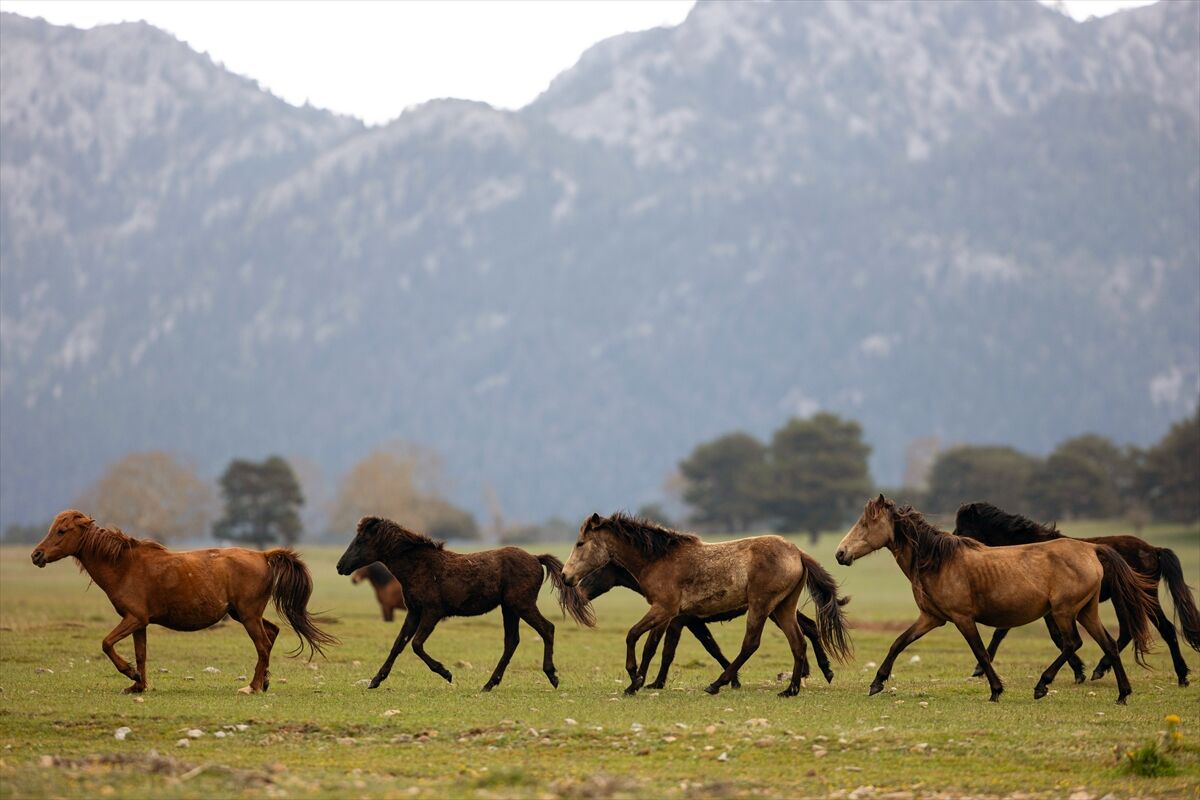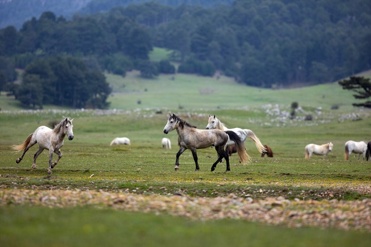 Yeşile bürünen ovada sürüler halinde dolaşan yılkı atları renkli görüntüler oluşturuyor.