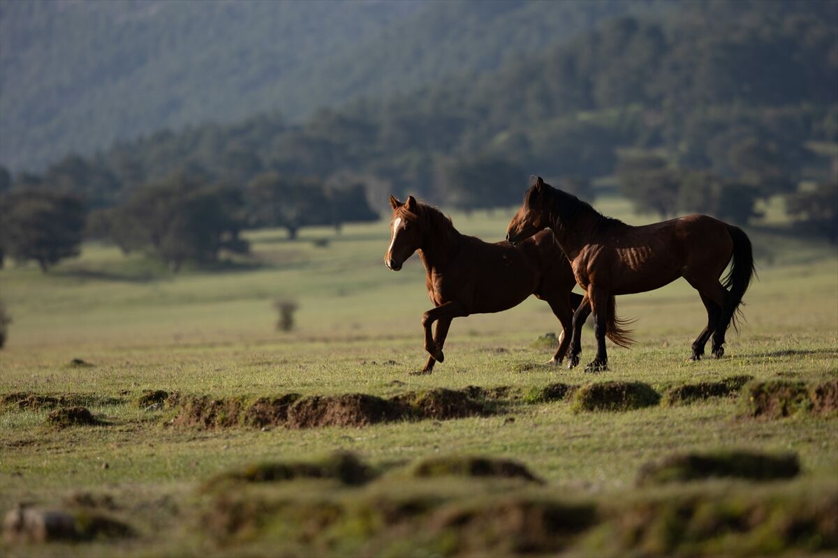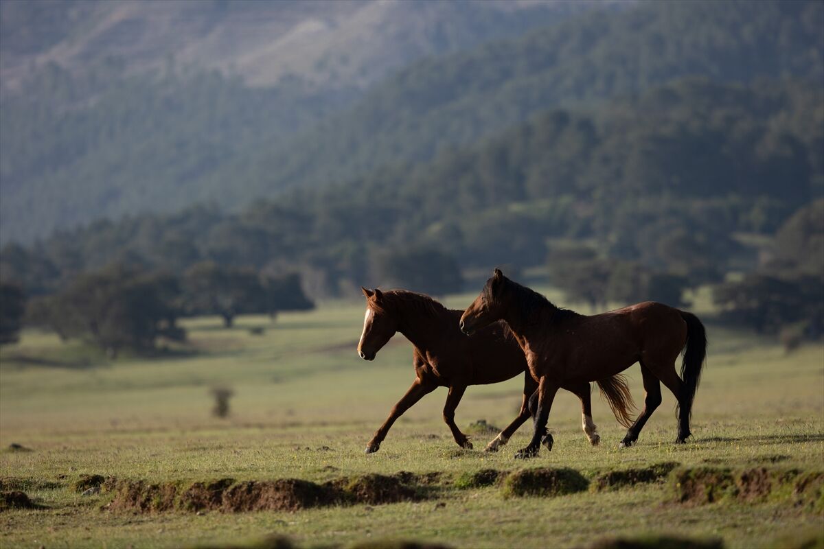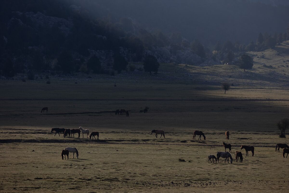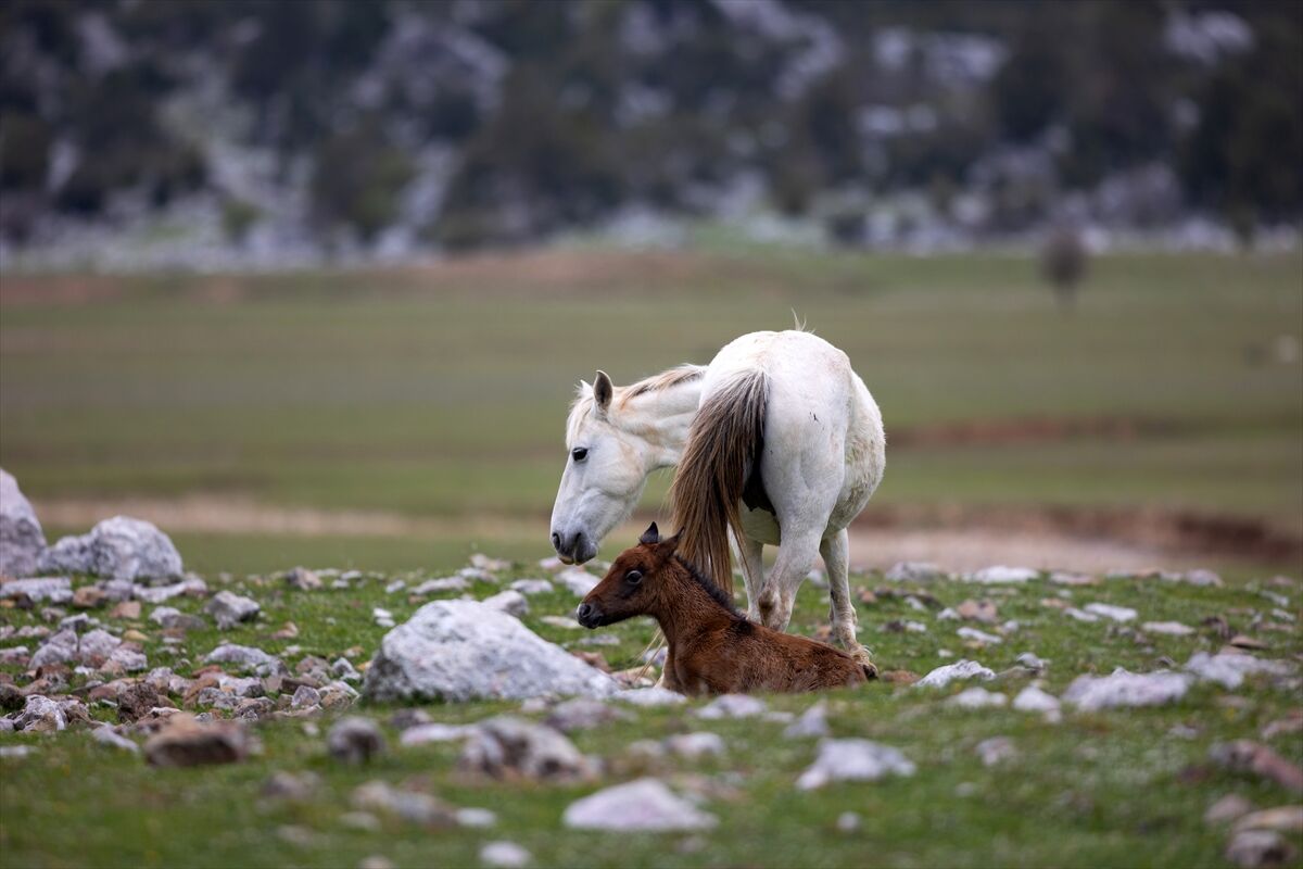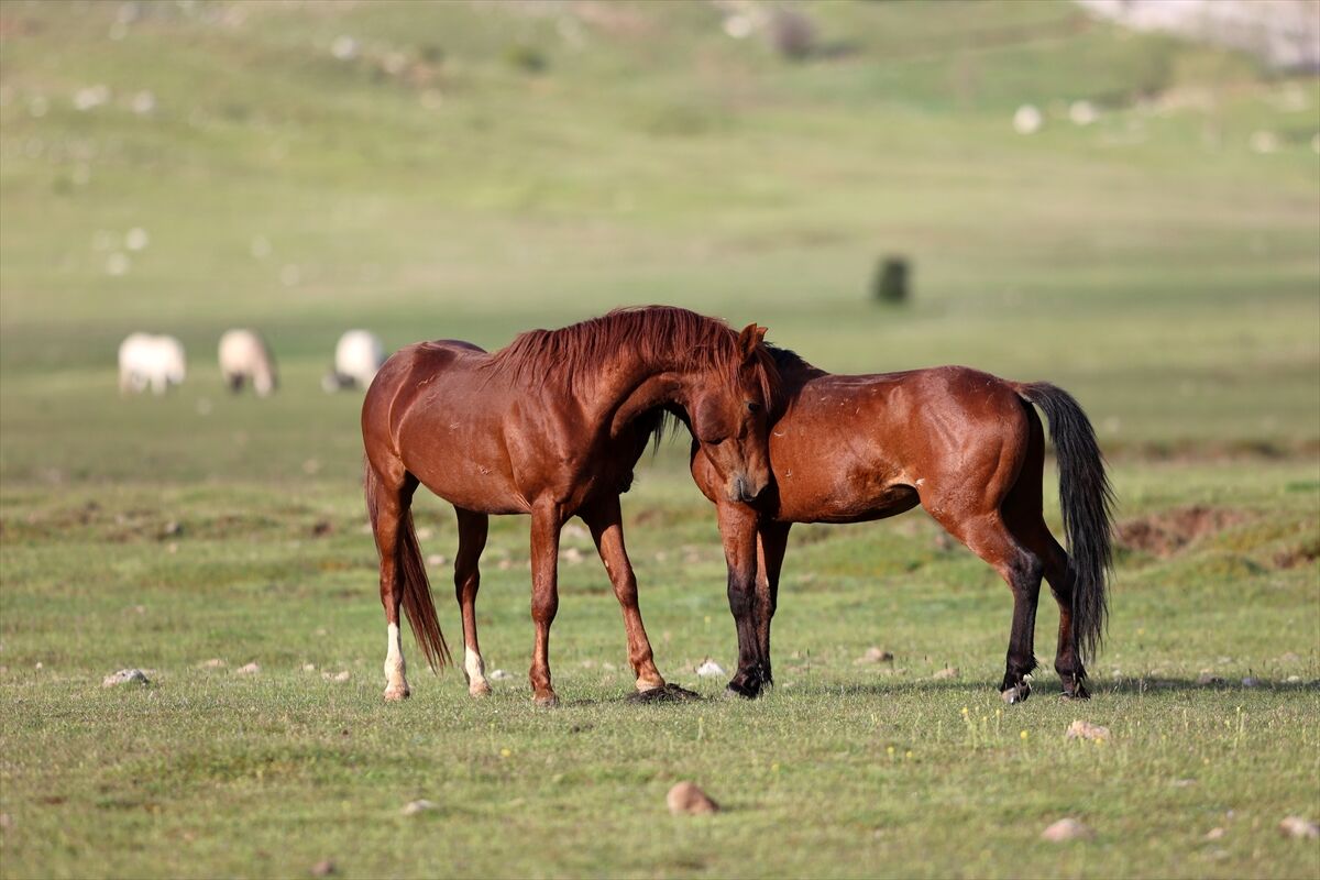 Yeşile bürünen ovada sürüler halinde dolaşan yılkı atları renkli görüntüler oluşturuyor.