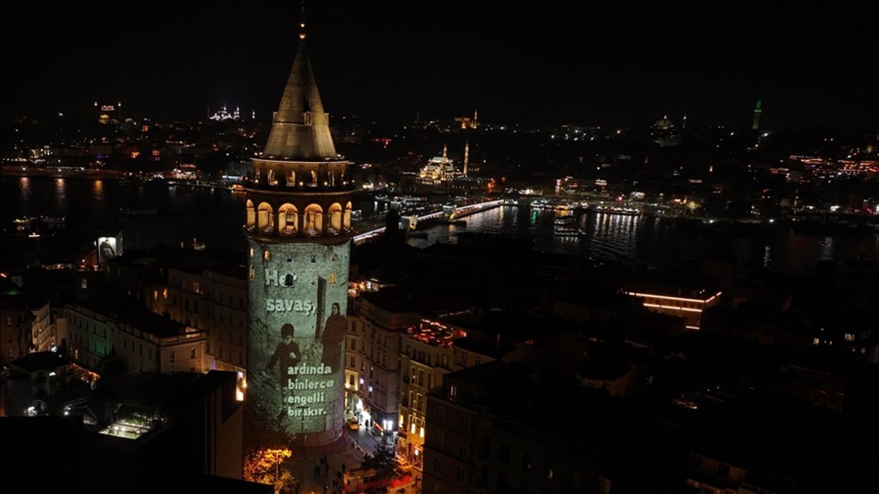 Kuleye, savaşlar sonrasında engelli kalan çocukların ve sivillerin anlatıldığı video ile "Savaş nerede olursa olsun, ardında sadece yıkım bırakır. Yıkılan sadece şehirler değildir. Hayaller yıkılır, bedenler sakatlanır, hayatlar yarım kalır. Her savaş, ardında binlerce engelli bırakır. Biz diyoruz ki savaşları engelleyin, engelli kalmayalım." yazısı yansıtıldı.