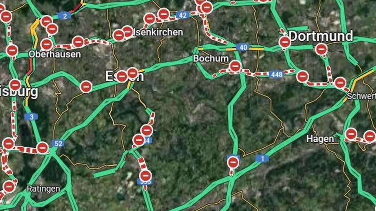 Frankfurt, Hamburg ve Berlin gibi büyük şehirlerin çevresindeki otoyollar, uygulamada kırmızı noktalarla kapalı olarak gösterildi. Bu durum, Belçika ve Hollanda'nın bazı bölgelerini de etkiledi.
